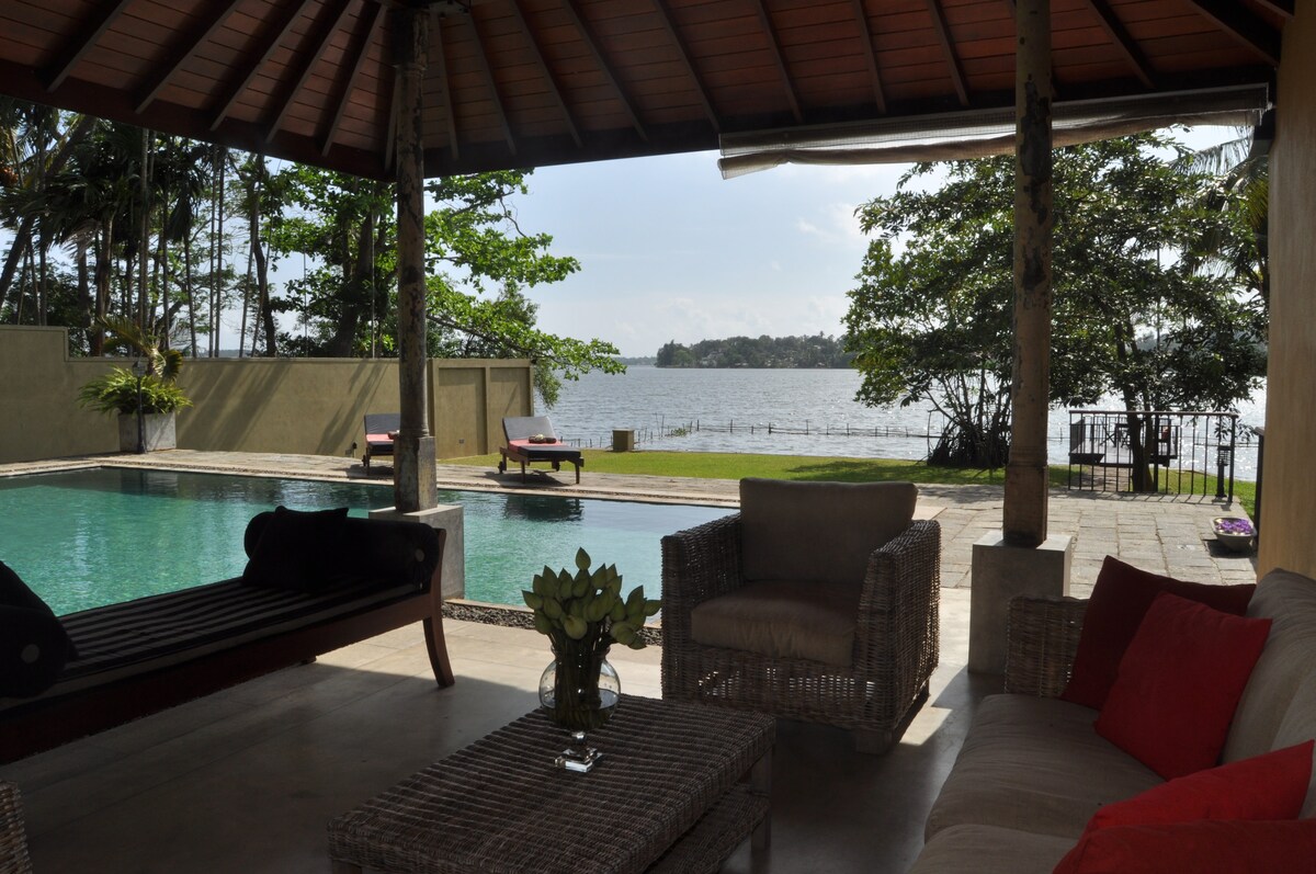 ¡TODA LA VILLA es solo para ti/tus huéspedes! FRENTE AL LAGO, moderno, espacioso, mansión con piscina infinita, chef interno y personal, además de desayuno gratuito. La villa está a solo 5 minutos del parque acuático PealBay/ Go-Kart Centre y a 40 minutos en coche de SL Capital...El aeropuerto, Galle y algunas playas finas están a MENOS DE UNA hora en coche. También puedes pedir todas las comidas y entretener a otros huéspedes visitantes en la villa. Esta villa es perfecta para los turistas como base o para los expatriados de Sri Lanka en vacaciones.