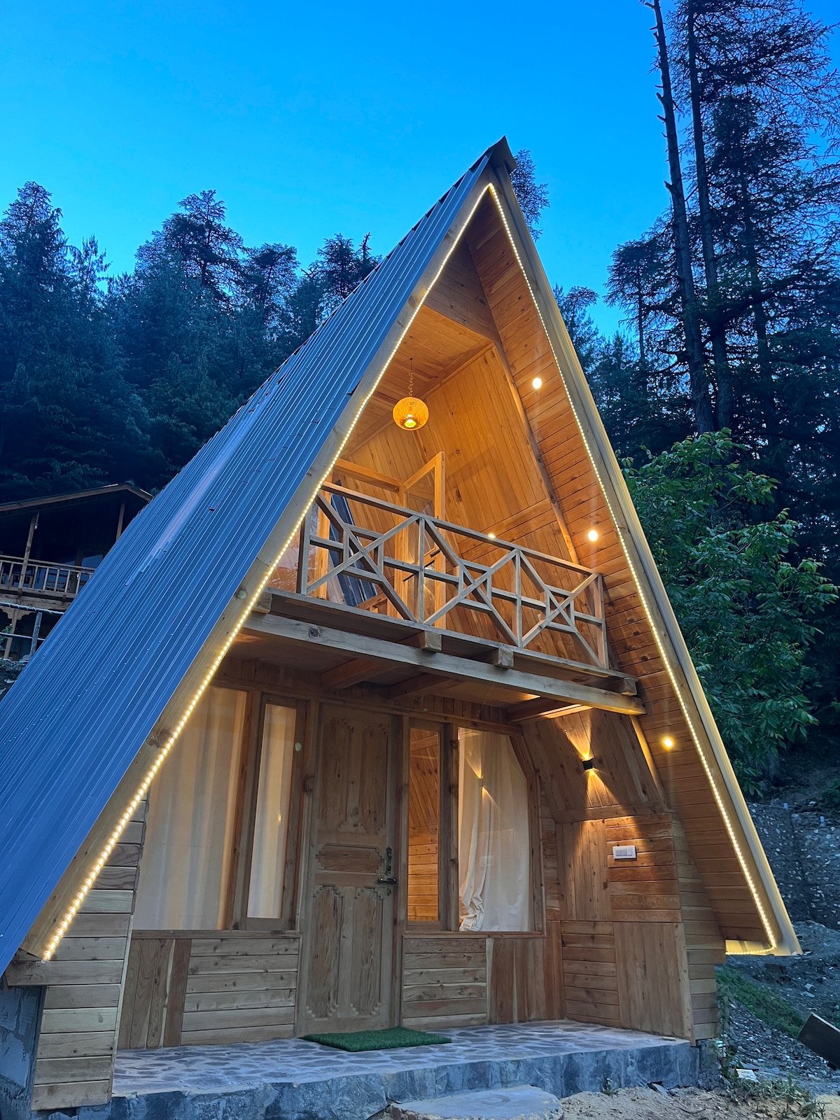 nos complace darte la bienvenida en nuestra casa de campo dúplex de lujo de nueva construcción A Frame, ubicada entre árboles deodar cerca de Jibhi. Por favor, sé nuestros huéspedes para disfrutar de la paz y nuestra hospitalidad para tus vacaciones en el Himalaya. Esta cabaña tiene capacidad para 5 personas. te ofrecemos las comidas de nuestra cocina local. alojándote con nosotros, estás muy cerca de todos los principales atractivos de jibhi y thirthn vally.