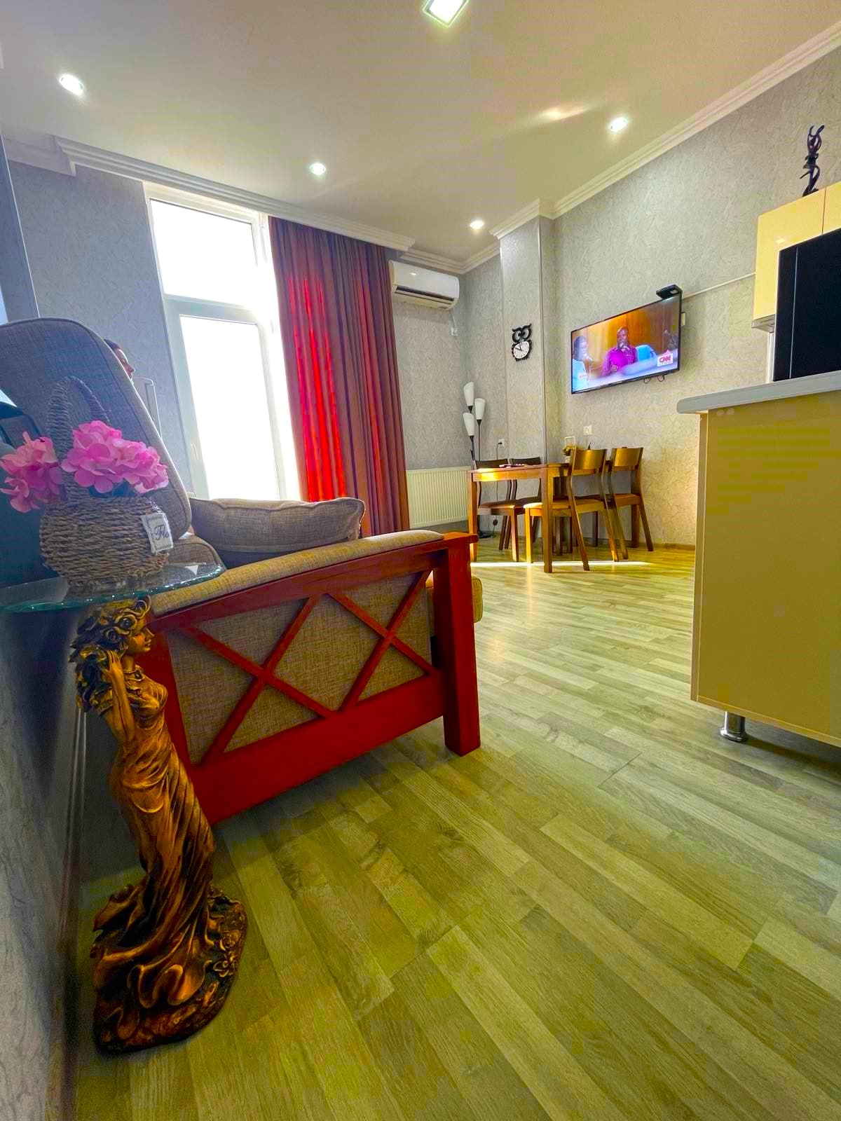 ¡Escápate a tu paraíso privado de entretenimiento en Kutaisi! Ya sea que llueva o haga mucho calor afuera, nuestro apartamento es el refugio perfecto para relajarse, descansar y divertirse, ubicado a solo diez minutos a pie del centro de la ciudad. Entra en un apartamento elegante y cómodo diseñado tanto para el descanso como para el entretenimiento. El espacio es tu cine personal y sala de juegos, todo en uno.