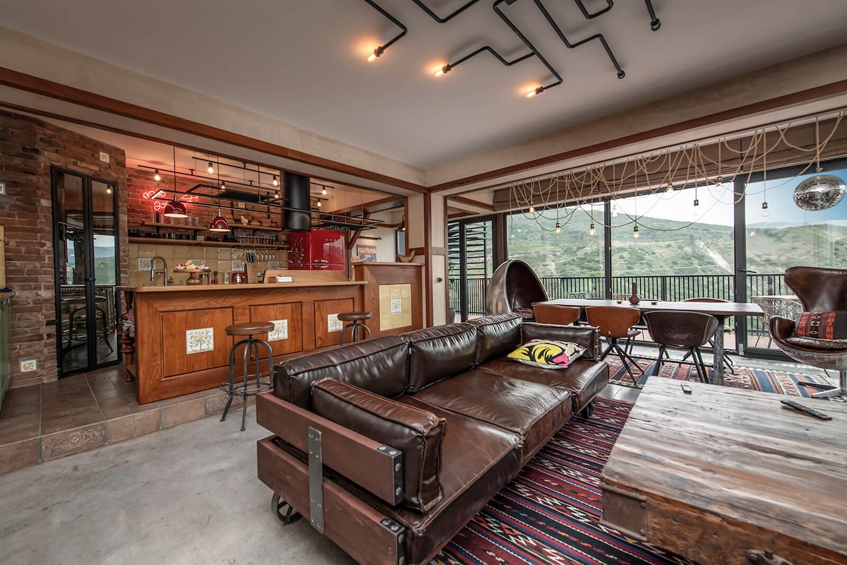 Nuestra villa ecológica está a 30 km del centro de Tiflis, situada a 1350 m sobre el nivel del mar. ¡Perfecto escondite para la paz, el aire fresco y las impresionantes vistas, en días claros se puede ver el Monte Ararat! La villa tiene 108 m², con 2 dormitorios, para 4 huéspedes. Hay una gran sala de estar con ventanas panorámicas, una cocina totalmente equipada, muebles cómodos y una chimenea eléctrica. Exterior: una bañera de hidromasaje, una bañera de madera finlandesa, una sauna finlandesa y una parrilla. También hemos añadido un altavoz y no hay límites de ruido.