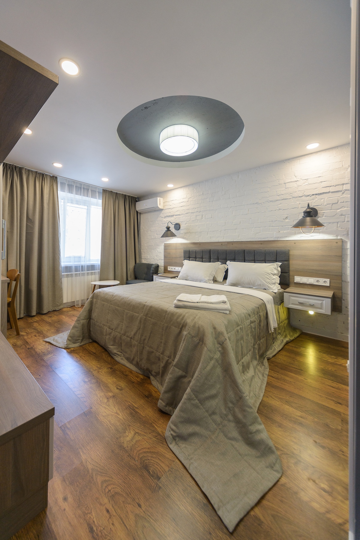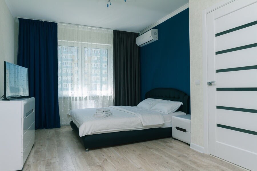 Un acogedor y moderno estudio tipo hotel con elementos de estilo loft. El apartamento se ubica en el tercer piso. El edificio está situado en el centro de Kiev, cerca del centro comercial Gulliver, no muy lejos del Estadio Olímpico y de la calle Khreshchatyk, a 5 minutos a pie de la estación de metro «Palacio de los Deportes». El apartamento tiene una cama tamaño king y, si es necesario, una cama plegable adicional. El estudio tiene una pequeña cocina, baño y aseo con todo lo necesario, TV e internet.