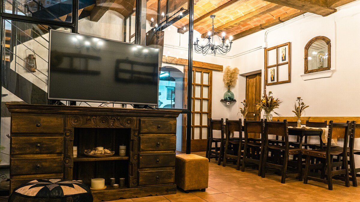 El granero dispone de un salón comedor con cocina negra, una habitación con cama doble, altillo con dos camas y sofá cama en el salón. También tiene doble ducha con ventana para poder admirar la naturaleza mientras te duchas. Chimenea, piscina y rio. Y un entorno con un conjunto monumental formado por una iglesia románica con cripta, un cementerio modernista y poblado íber a 5min. Espectacular! A 5 min un restaurante rural y a 10 min el pueblo/ciudad.