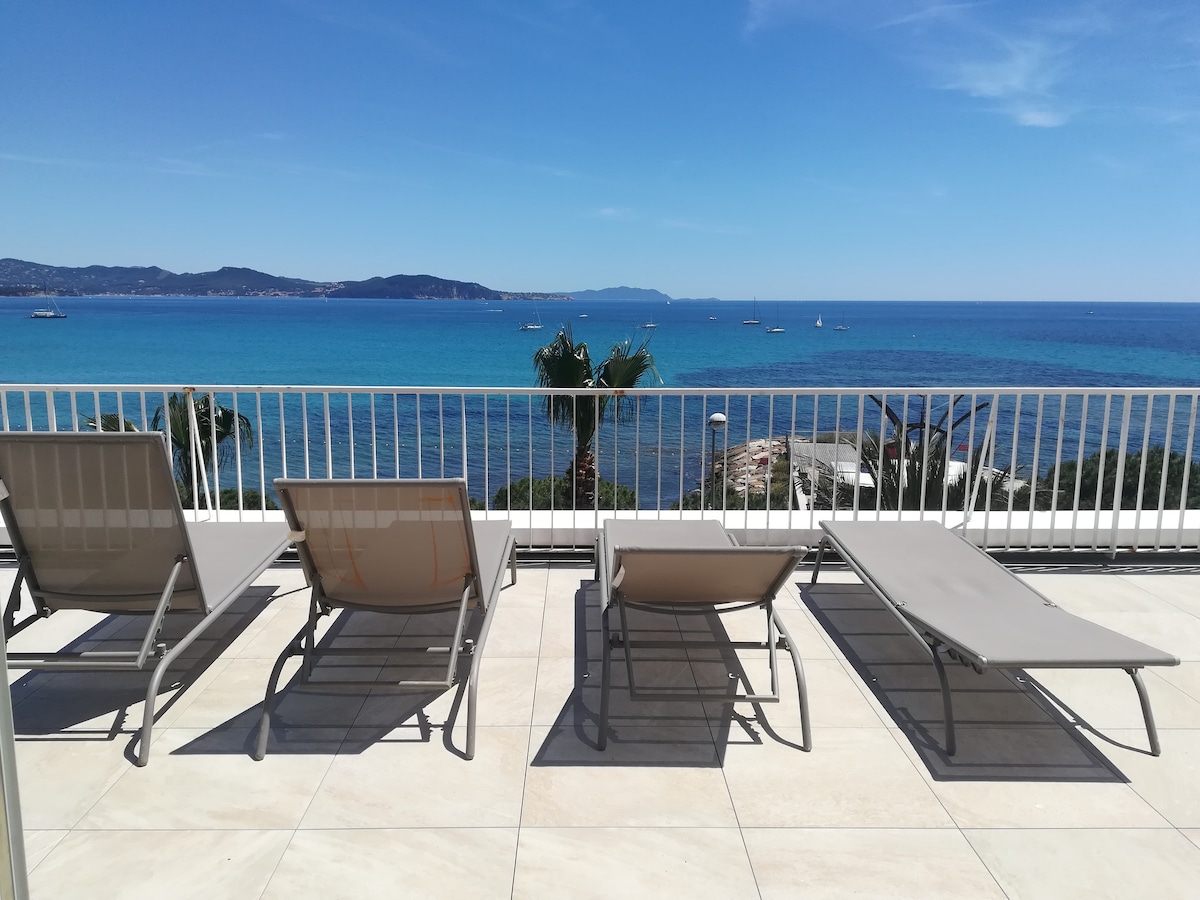 En el cuarto y último piso sin ascensor, frente al mar frente a la playa, magníficas vistas al mar, azotea superior de 95 m² reformada, con aire acondicionado, moderno y luminoso, terraza privada de 170 m² alrededor con vistas de 360°. Gran sala de estar, cocina totalmente equipada. 3 dormitorios y terraza con aire acondicionado y vistas al mar de cada habitación, s. de baño, ducha al aire libre, 2 aseos, 1 plaza de aparcamiento al aire libre. Frente a la playa, cerca de clubes de vela y buceo, oficina de turismo, cine, centro de la ciudad, puerto, mercados.