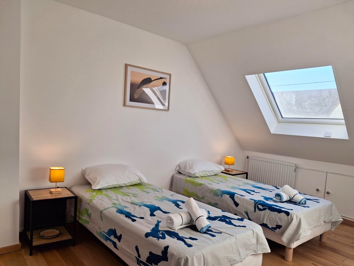 Serenity: Amplia casa completa con 4 dormitorios para hasta 8 personas, ideal para familias, reuniones o equipos profesionales. Gran sala de estar luminosa con cocina abierta equipada, camas separadas y amplio comedor. Situado en una zona tranquila y residencial, a 5 minutos a pie del tranvía Cosmonaute que ofrece un acceso rápido a París y a los centros de negocios. Adecuada tanto para vacaciones escolares como para misiones y estancias profesionales durante la semana.