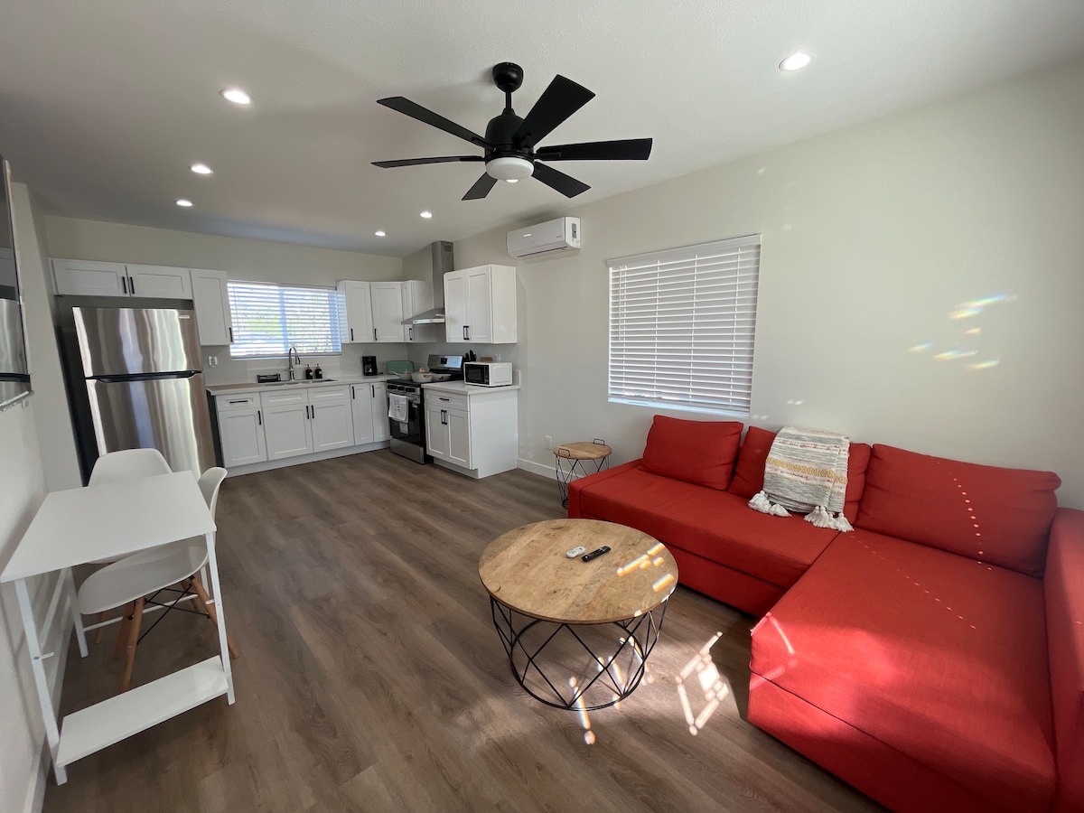 Relájate en esta escapada única y tranquila, situada en una granja orgánica de cítricos en un terreno privado de 27 acres con vistas a la montaña y al valle de los cítricos y los aguacates. Esta unidad tiene su propia entrada privada y una terraza privada con fregadero al aire libre, barbacoa y zona de comedor. El espacio habitable interior es de aproximadamente 930 pies cuadrados, y el área de la cubierta es de aproximadamente 750 pies cuadrados. La casa funciona con energía solar y baterías Tesla, por lo que no tendremos un apagón incluso durante los cortes de energía, siempre y cuando no se utilice mucho aire acondicionado.