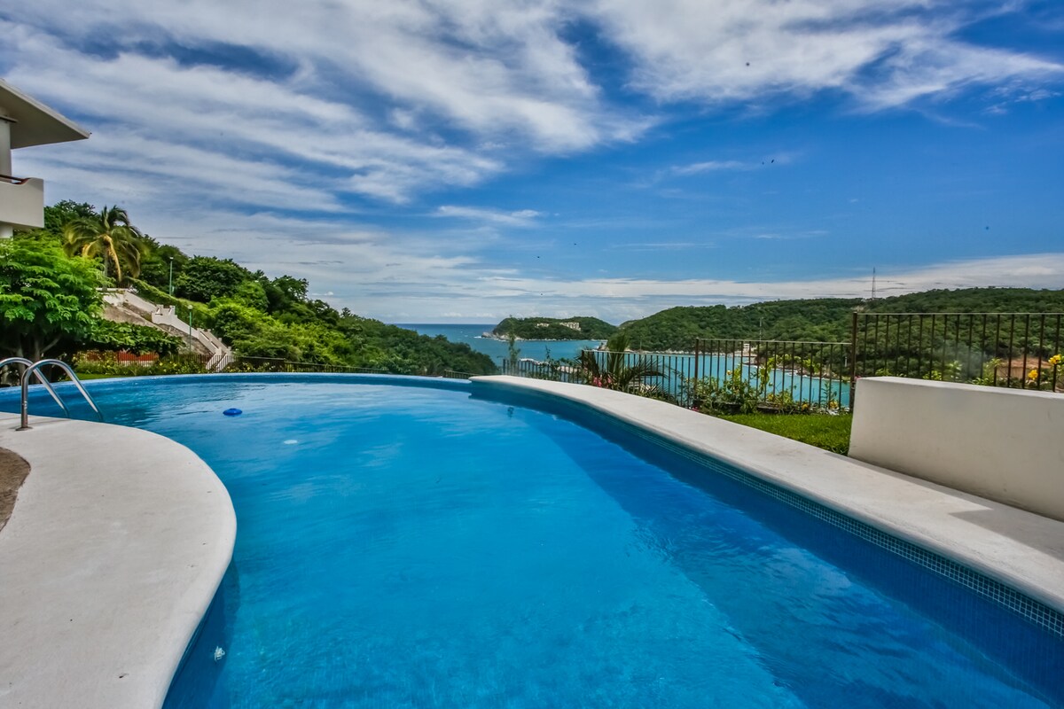Cómodo y espacioso apartamento con vistas a la magnífica bahía de Santa Cruz y al puerto deportivo. ¡Disfruta de las vistas a la bahía junto a la piscina o relájate en el patio y disfruta de la puesta de sol mientras cae sobre las colinas de Oaxaca! Apartamento con vistas al mar con capacidad para 6 personas. Las tarifas comienzan en 2, el precio se ajusta según el número de huéspedes. Para obtener más espacio, consulta nuestros otros anuncios en CRUZ DEL MAR para grupos más grandes... ¡Alquila 2 o más! Acceso a la piscina compartida entre los edificios J y K. Internet de fibra óptica. Aire acondicionado en todas las habitaciones.