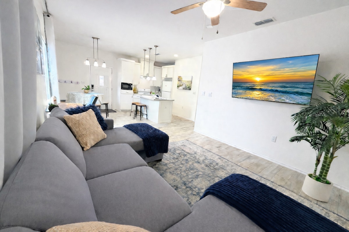 Limpio y relajante elegante dúplex de 2 camas y 2 baños para 6 personas en una nueva y tranquila subdivisión. Cocina totalmente surtida y W/D. Diseño abierto con techos altos, electrodomésticos nuevos, muebles nuevos, mostradores de cuarzo e isla, especias, cafés y tés. *¡A solo 6 minutos de los enchufes! Ubicación céntrica con fácil acceso a Harlingen, South Padre Island, Brownsville y McAllen para ir de compras/restaurantes, playa y entretenimiento. Ideal para todos los viajeros o pájaros de la nieve. ¡Descuento mensual!