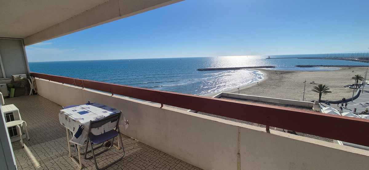 Ce logement exceptionnel par sa vue du 6ème étage avec terasse, son emplacement Quai Charles de Gaulle, plein centre de la Grande Motte et à 150 m de la plage. Tous les services et commerces au pied de la résidence. Amoureux de la Grande-Motte, nous avons rénové avec soin et équipé ce studio climatisé de 24 m2 plus une terrasse de 8m2 , pour que nous puissions y passer nos vacances et le proposer à la location, idéalement en couple ou avec 1 enfant. Draps linge de toilette en supplément