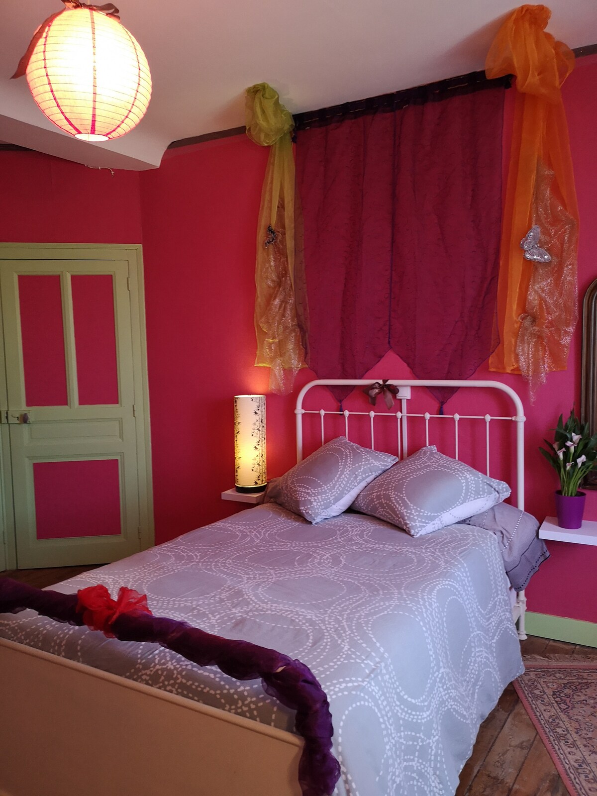 En una gran casa con estructura de madera, habitación con encanto con cama doble (posibilidad de cuna adicional) con ducha y aseo privados. Desayuno casero servido (de 8:00 a 9:30) en la sala de estar, el porche o el jardín según el tiempo. No hay posibilidad de preparar comidas en el lugar, pero se proporciona una mesa para hacer un pícnic en el jardín o en la terraza. Para nuestros amigos ciclistas: su bicicleta podrá pasar la noche a resguardo en la cabaña y recargar la batería si es necesario.