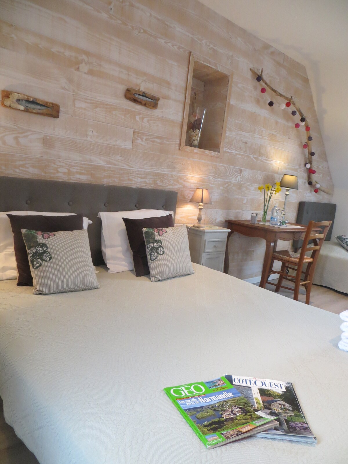 Bienvenido a Baie & Bocage Normandie. Situado en la primera planta de nuestra antigua granja reformada, se beneficiará de un espacio muy cómodo de 27 m2 con una decoración elegante y un ambiente relajante. Para 2 a 4 personas, su habitación Bocage tiene una cama tamaño king, un baño con ducha y aseo privado, así como todas las comodidades necesarias para pasar una estancia encantadora cerca de la orilla del mar y todos los lugares de interés, en el corazón de Normandía … Estaré encantado de recibirle.