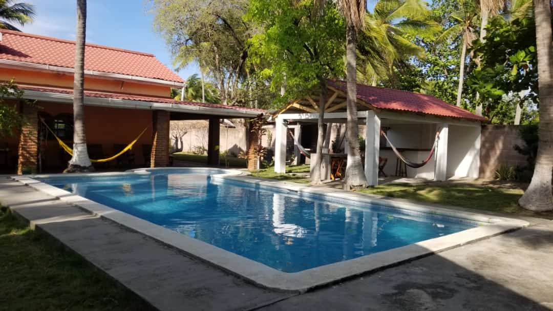 This beautiful American stile house was build 9 years ago, big areas, each bedroom has a bathroom. This five bedrooms 5 bathrooms house has brand A/C units. Amazing corridor and open areas with wood tables and chairs. You can relax on hamacas, rocking chairs and big bar area. This quite house feels like home. The kitchen and bar area is fully equipped if you like to cook your own meals. Is only 50’ from the beautiful salvadorean beach, come and relax watching the sun arise and sunset.