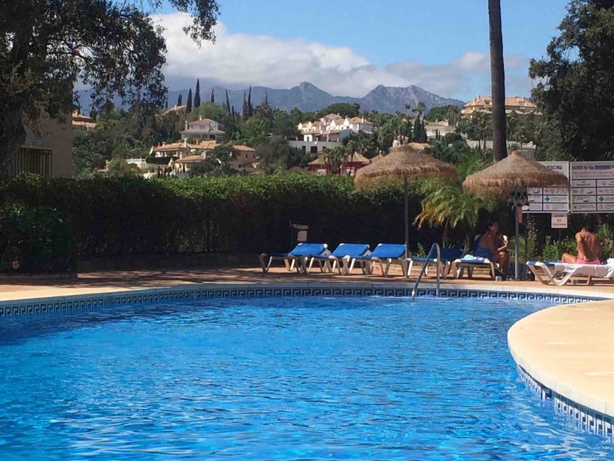 Nuestro apartamento de lujo está situado en un complejo de golf privado rodeado de jardines tropicales a 10 minutos de las hermosas playas de la Costa del Sol. Desde la terraza tenemos una hermosa vista de las montañas y el mar. Desde nuestro jardín se puede caminar hasta la hermosa piscina. Las instalaciones deportivas: golf, pádel, tenis, pentaque, gimnasio y bienestar también se incluyen raquetas de pádel y palos de golf En el recinto hay un delicioso restaurante (tripadvisor 4,5*) La animada Marbella con Puerto Banús está a 18 minutos en coche.