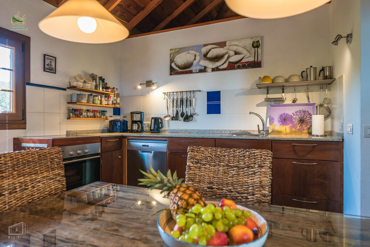 Vacaciones perfectas en nuestra finca orgánica de permacultura con un jardín tropical de 6000 metros cuadrados en el soleado oeste de la verde isla canaria. Disfruta de paz y tranquilidad a unos 600 metros sobre el nivel del mar y una magnífica vista panorámica del Océano Atlántico. En 100 metros cuadrados, nuestra casa de campo con aire acondicionado ofrece dos dormitorios dobles, amplia sala de estar, gran cocina con grupo de comedor, calefacción y chimenea, así como varias terrazas, parcialmente cubiertas. Conoce tus preocupaciones en este alojamiento espacioso y tranquilo.