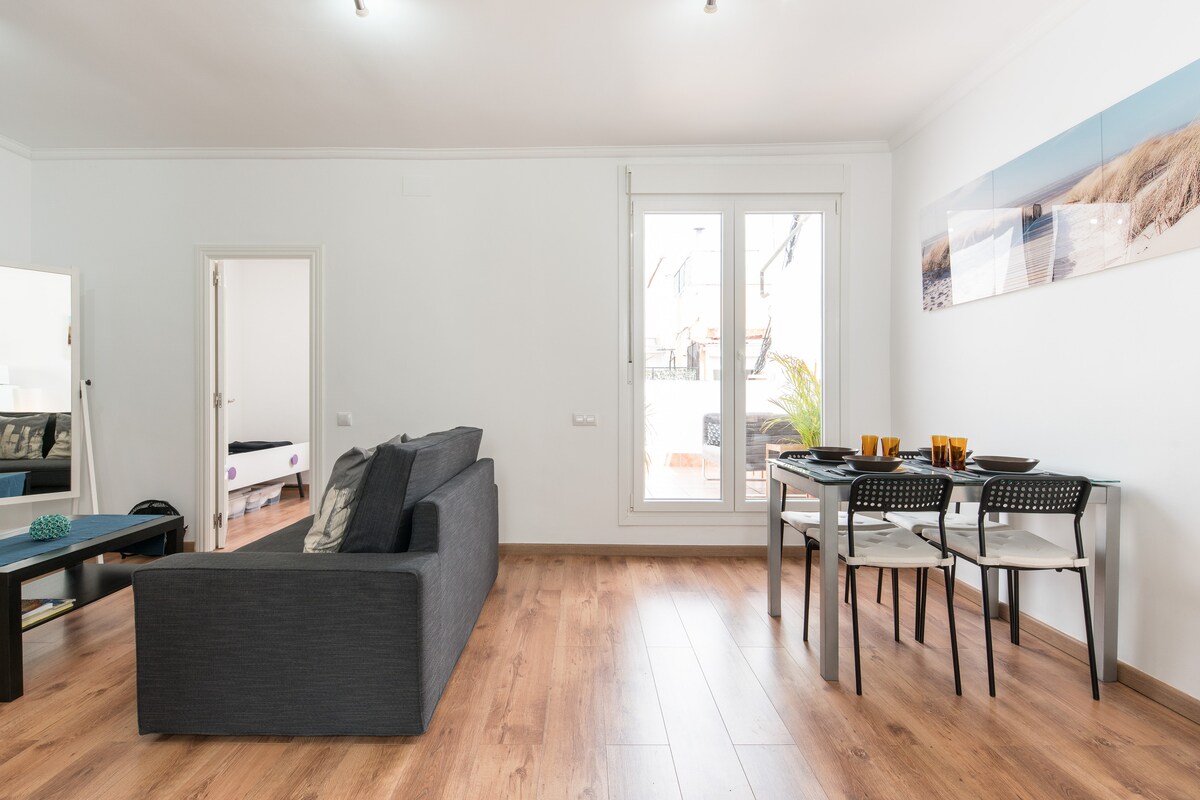 PRIVATE !! space. !!! and super quiet, full of sun and nice TERRACE !! Two air conditioners, You have to climb some flights of stairs (see photos) that are very confortable YOU HAVE ELECTRONIC INPUT!! Possibility of leaving luggage at the entrance when you arrive!!! N* REGISTRO: alquiler asociado al CRU :(-08063000057032-) ESFCTU00000806300005703200000000000000000HUTB-0068983, Finca Urbana Completa, : para uso turístico de corta duración con número de licencia CCAA HUTB-006898.