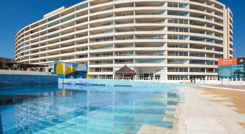 Este moderno edificio cuenta con accesos controlados, ascensor, piscina con olas (verano), piscina con bar, piscina infantil, piscina interior temperada, hidromasajes, spa/sauna, sala de juegos, áreas verdes, gimnasio, quinchos, juegos infantiles, restaurante, sala multiuso y lavandería. Ubicado en Avenida del Mar, primera línea, cerca de escuelas de surf, restaurantes, comercio y bellos atardeceres. Algunas instalaciones son gratuitas y otras de pago, según fecha de reserva.