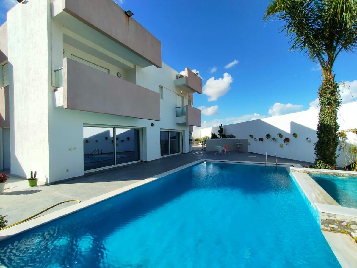 Vaste Villa S5 décorée dans un style tunisien chic mêlant charme local et authenticité. Parfaite pour se détendre dans un cadre élégant et apaisant, très proche des plus belles destinations de la banlieue nord de Tunis. •Grand jardin avec table de ping pong •Grande piscine privée sans vis à vis ensoleillée •Wifi, climatisation, cheminée et cuisine entièrement équipée •Située dans un quartier calme et sécurisé •À 12–19 min de Carthage, Sidi Bou Saïd et La Marsa •Parking dispo