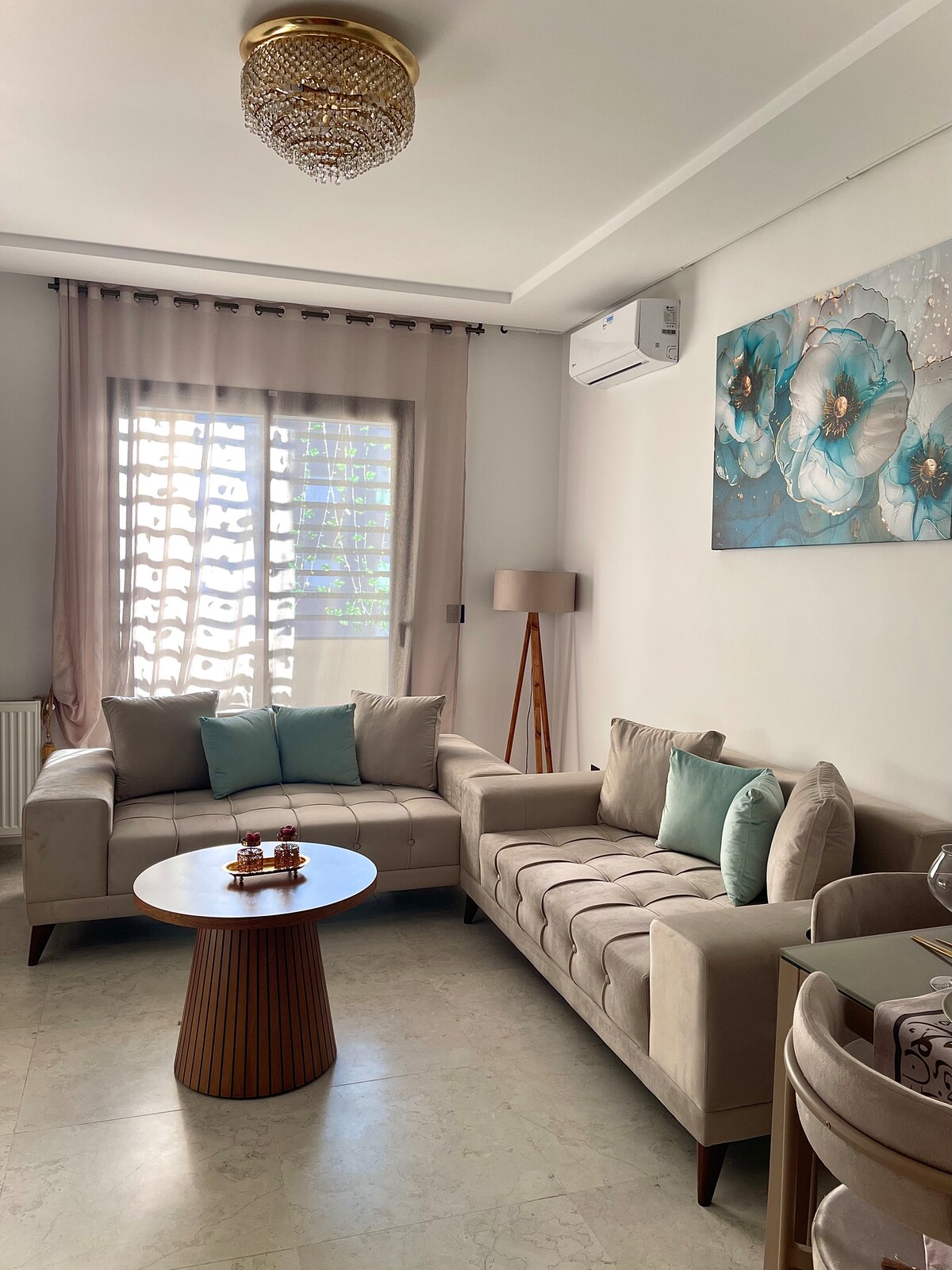 Relájese en este alojamiento tranquilo y acogedor, lujosamente equipado y con una decoración armoniosa que garantiza una estancia agradable. El apartamento se encuentra en una zona residencial tranquila, consta de una sala de estar con sofá cama, un dormitorio con balcón y una cocina americana bien equipada. 📍Ubicado cerca de todas las comodidades: Carrefour, restaurantes, cafeterías, salones, gimnasio, farmacia… El aeropuerto de Túnez-Cartago está a 5 minutos.