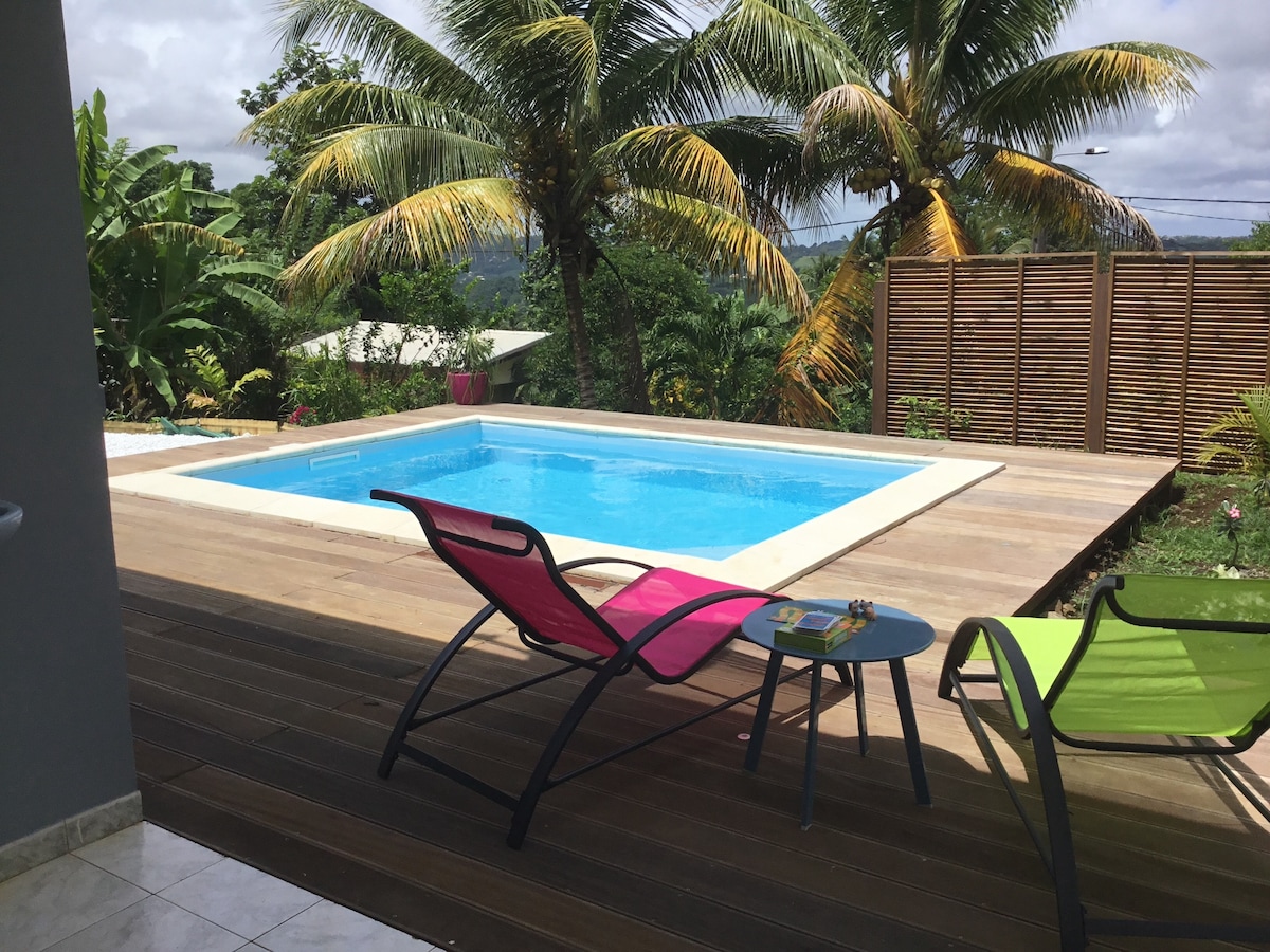 Bonjour Nous vous proposons notre petit bungalow tout mignon. Il est accolé à notre maison mais seule l'entrée principale est commune. Vous aurez votre espace privé et indépendant. Il est composé d'une chambre de 17 m² avec sa salle d'eau attenante ainsi que d'une terrasse de 15 m² avec cuisine extérieure. Vous pourrez profiter de la vue sur les pitons du Carbet en sirotant votre ti punch. Une petite plage peu connue et charmante est à moins de 10 min à pied.