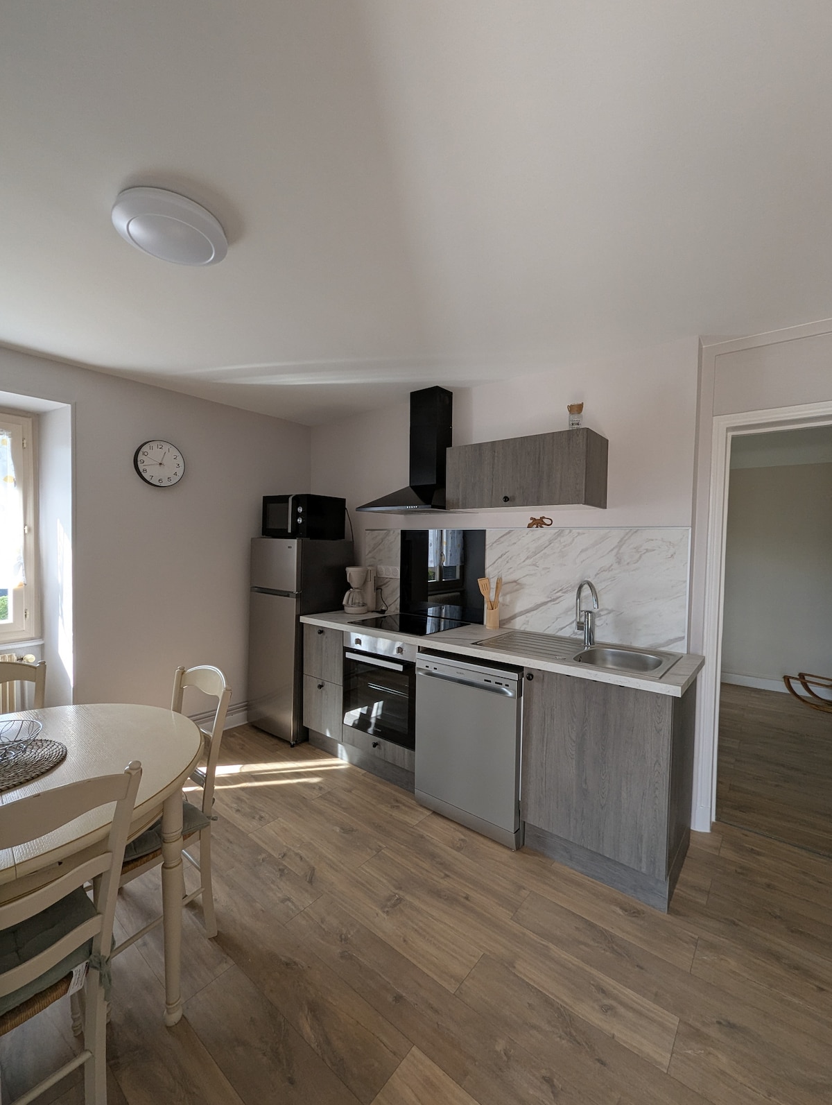 Nid douillet privé en entresol dans ancien hôtel rénové au cœur du village en desertification de Rochefort Montagne idéal pour randonnée, ski, et découverte de l'auvergne, du Sancy et de la chaine des puys. Baignoire à remous, climatisation, lit Emperor (2x2m), Matelas EMMA sur lattes, cuisine toute équipée avec lave vaisselle, four, four micro ondes, batterie d'ustensiles, fondue, crêpe, raclette, feux gaz et plaques induction, réfrigérateur SMEG, lave linge, sèche linge, TV LG