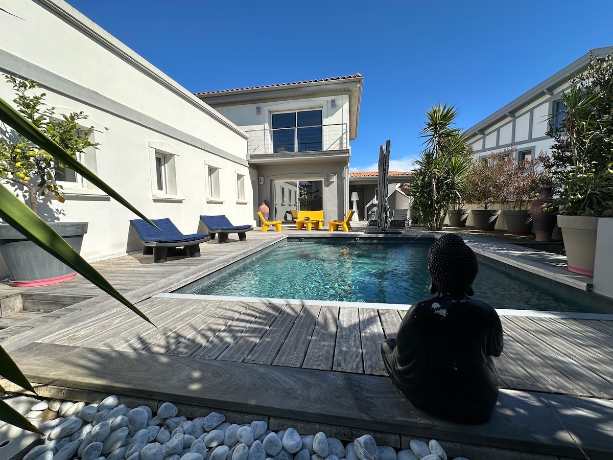 Encantadora casa de 1924 reformada por un arquitecto, decoración contemporánea, jardín paisajístico, piscina climatizada (sales) en temporada y en función del clima. - Planta baja: terraza/salón, cocina en el comedor, salón. Habitación con 1 cama de 160 x 200 cm con cuarto de baño abierto y aseo separado. - R+1: salón, dormitorio n.° 2, claraboya, 1 cama de 160x200 cm. - Habitación n.° 3, 1 cama de 160 x 200 cm. -1 cuarto de baño con inodoro y lavandería. - Terraza con mesa de comedor, salón y sombrilla. Ducha exterior con agua caliente y plancha de gas