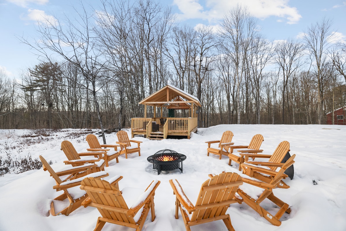 *¡El proyector para exteriores ya está aquí!* Este espacioso y pequeño refugio está totalmente equipado para unas vacaciones familiares memorables o una escapada romántica en pareja. Sumérgete en tu jacuzzi privado, brinda con s'mores junto al fuego, balancéate en la hamaca bajo las estrellas o quédate y disfruta de horas de juego en nuestra nueva Nintendo Wii. Disfruta de acceso a 2 playas, una piscina olímpica (según la temporada), minigolf, canchas de tenis y más. A pocos minutos de los favoritos de Pocono, como esquí, casinos y parques acuáticos.
