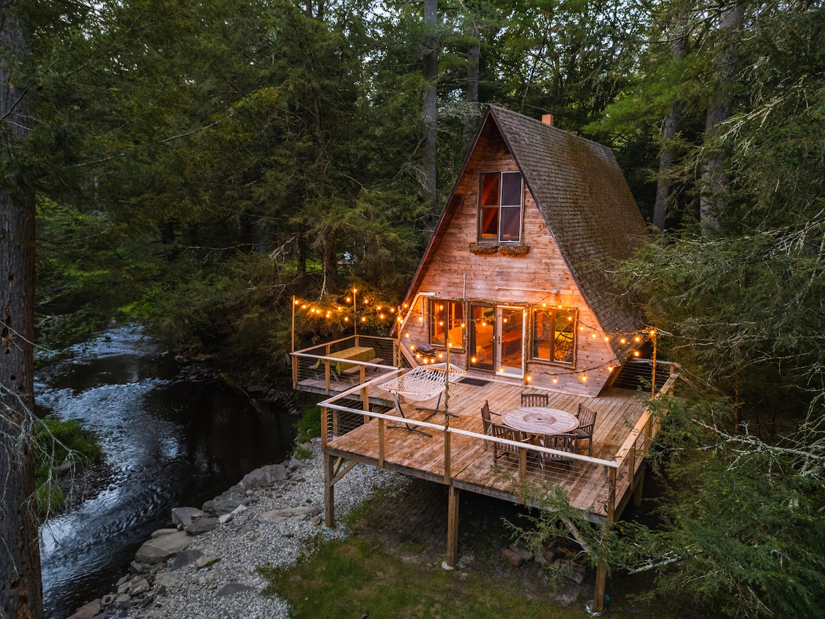 Escápate a nuestra mágica cabaña Riverside A-Frame en 4 acres aislados. Nada en el río encantador, cocina la cena bajo los árboles y reúnete junto al fuego bajo las luces centelleantes y un cielo salpicado de estrellas infinitas. Observa ciervos, águilas y luciérnagas mientras te relajas en esta acogedora cabaña de 2 dormitorios. Perfecto para parejas, amantes de la naturaleza y cualquier persona que desee un refugio tranquilo. A minutos de caminatas panorámicas y aventuras en el río Delaware que conectan profundamente con la naturaleza: sal con la sensación de haber salido de un libro de cuentos.