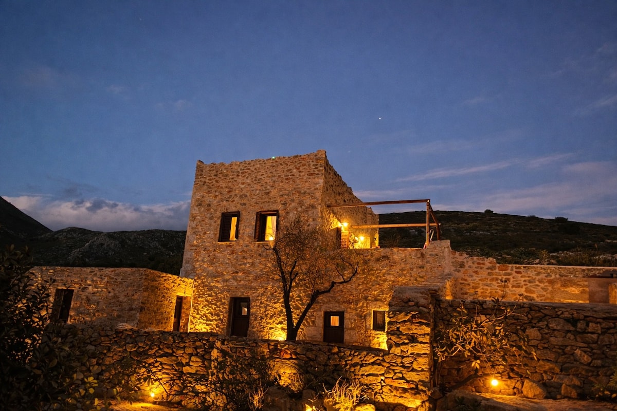 A traditional stone tower from 1819, nestled in the heart of Areopoli. At its base, graceful stone arches preserve centuries of history, blending with subtle modern touches. Step inside and the noise of the world fades away. Thick stone walls filter sounds, while the scent of night-blooming jasmine fills the senses. A peaceful courtyard, hidden behind high stone walls, invites quiet moments and lazy summer siestas. Evenings here are for wine, stories, and the timeless spirit of Mani.