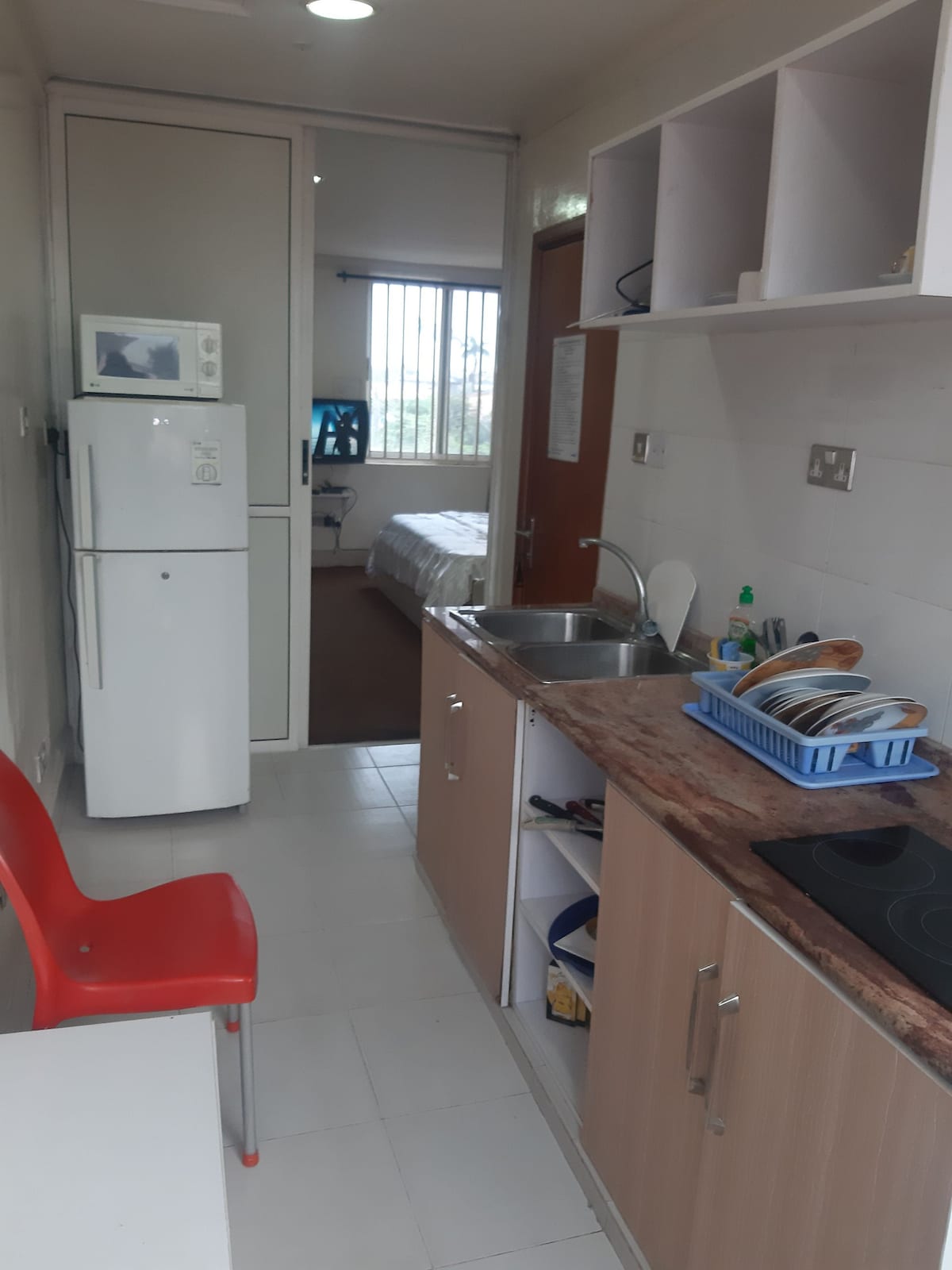 You’ll love the stylish decor of this charming place to stay. It’s a one bedroom apartment with a shared sitting room, dinning, kitchen and a private toilet. Ac also available, microwave, running water, washing machine, and chilling fridge. Also Netflix, Dstv and YouTube on the go. Also there is a provision for meals on request ranging from stew, soup and others. Also light all through the night till dawn at least 10-15+ hours light daily.
