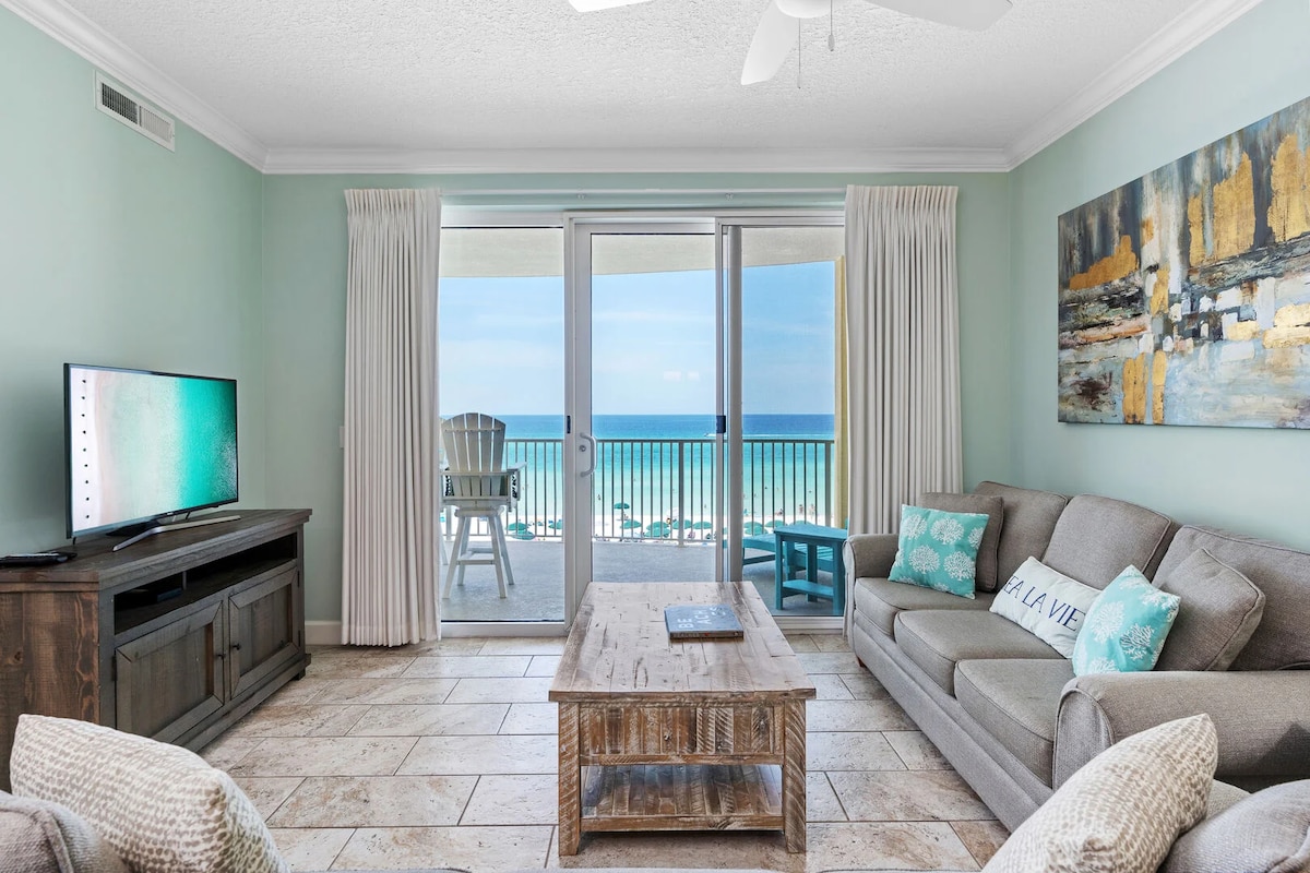 NO EXTRA FEES AFTER BOOKING! Wake up to Gulf views from your PRIVATE BEACHFRONT BALCONY in this charming, low-rise condo. Step directly onto sugar-white sand and emerald waters just outside your door. Enjoy a year-round, seasonally heated pool with an easy walk to Pier Park for dining, shopping, attractions, and nightlife. Looking for different dates or layout? I own 5 condos in this building. Click my host profile, then scroll down to view all of my listings.🌴