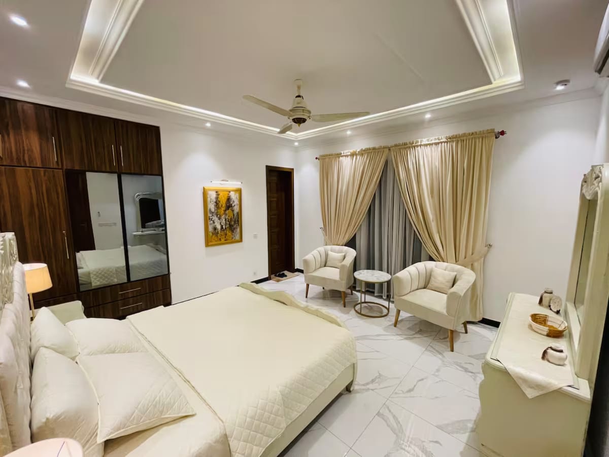 Experience contemporary luxury in our Modern Boutique House located in the DHA Phase 5, Lahore. Enjoy expansive living areas, tastefully decorated bedrooms, a fully equipped kitchen, private terraces, and an exclusive in-house Gym. Conveniently located just minutes from Lahore’s finest dining, upscale shopping, parks, LUMS, Gulberg, Raya, Airport, Ring Road and more, this elegant residence is ideal for families, groups, and especially foreigners seeking comfort, security, and Luxury living.