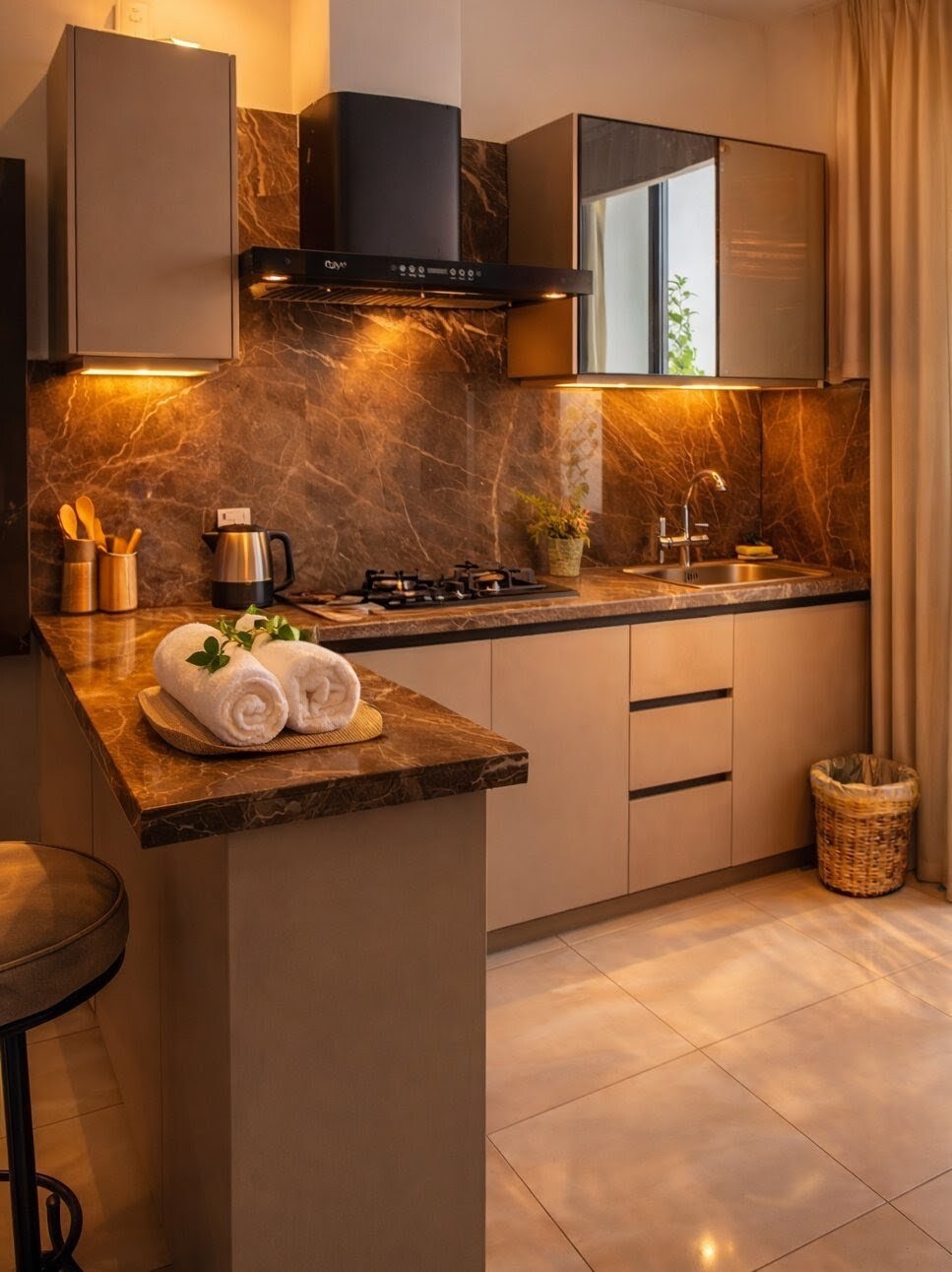 Our 1 BHK Orbit Penthouse in DHA Phase 5 is where urban chic meets celestial cool. Think: a glowing moon wall for those late-night selfies and a bold dollar-stacked art piece that screams "main character energy" Wake up to park views from your private balcony swing, binge your faves on the 50" 4K Smart TV, or cook up something aesthetic in the fully loaded designer kitchen. The interiors? Abstract, stylish, and made for the feed. Plus, you're right next to Lahore's hottest dining spots.