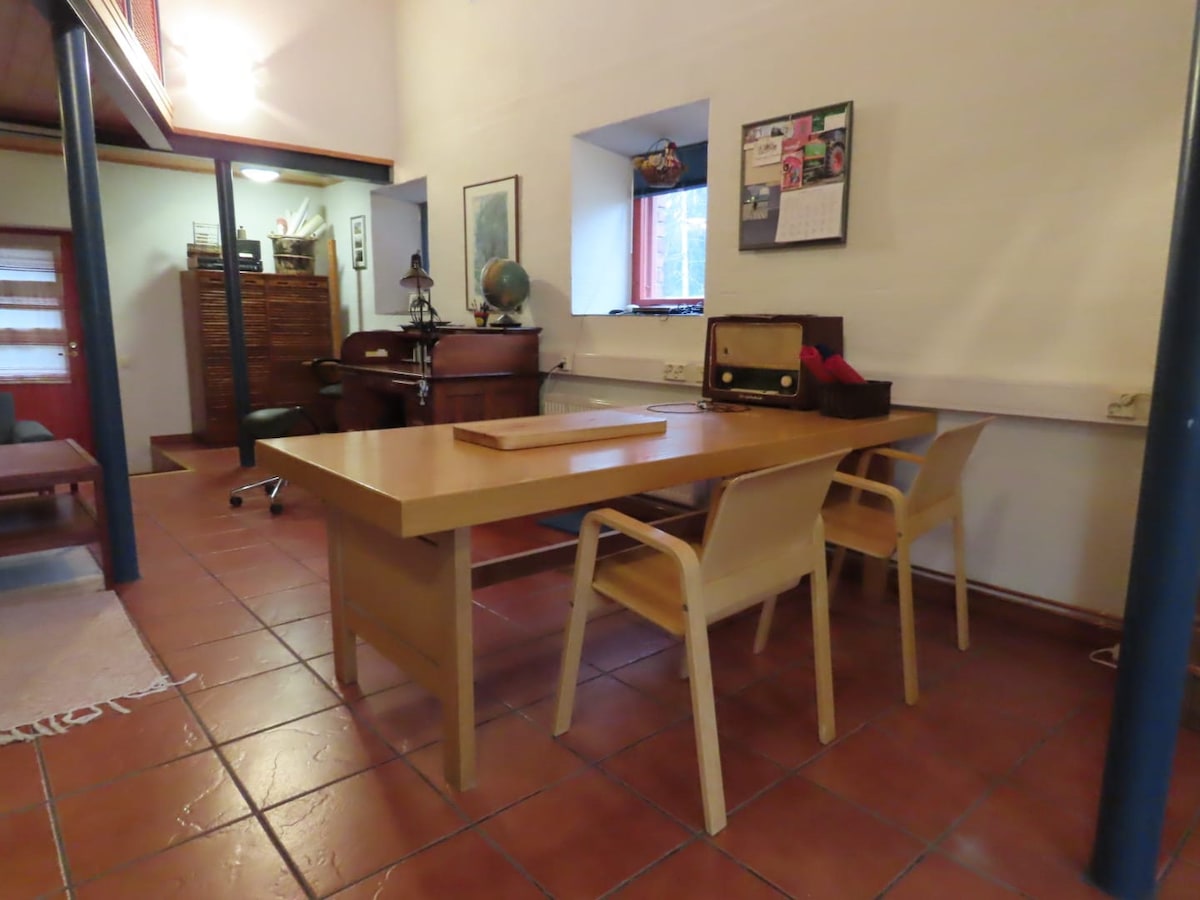 Disfruta de la paz y la tranquilidad del campo en nuestro edificio de oficinas de granja, ahora transformado en un Airbnb fresco perfecto para los días calurosos de verano. El espacio renovado forma parte de un antiguo granero y está separado del edificio principal, lo que te da una gran privacidad durante tu estancia. Lugar de baño a 600 m. Estamos ubicados a 15 km del centro de Sysmä. Ten en cuenta que no hay transporte público a Airbnb