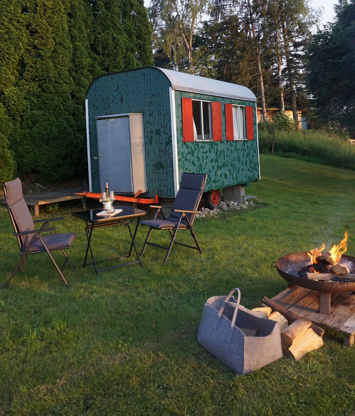 En medio del prado verde en nuestro jardín, ofrecemos un auto para dormir cuidadosamente diseñado para alquilar. Para un máximo de dos personas, ofrecemos un retiro relajado aquí con la posibilidad de fogata y uso de nuestra propiedad. El vagón está equipado con electricidad, una cafetera cápsula y todo lo necesario para un fácil uso diario. En la casa de al lado hay una ducha de agua caliente y un inodoro. ¡Nos vemos pronto!