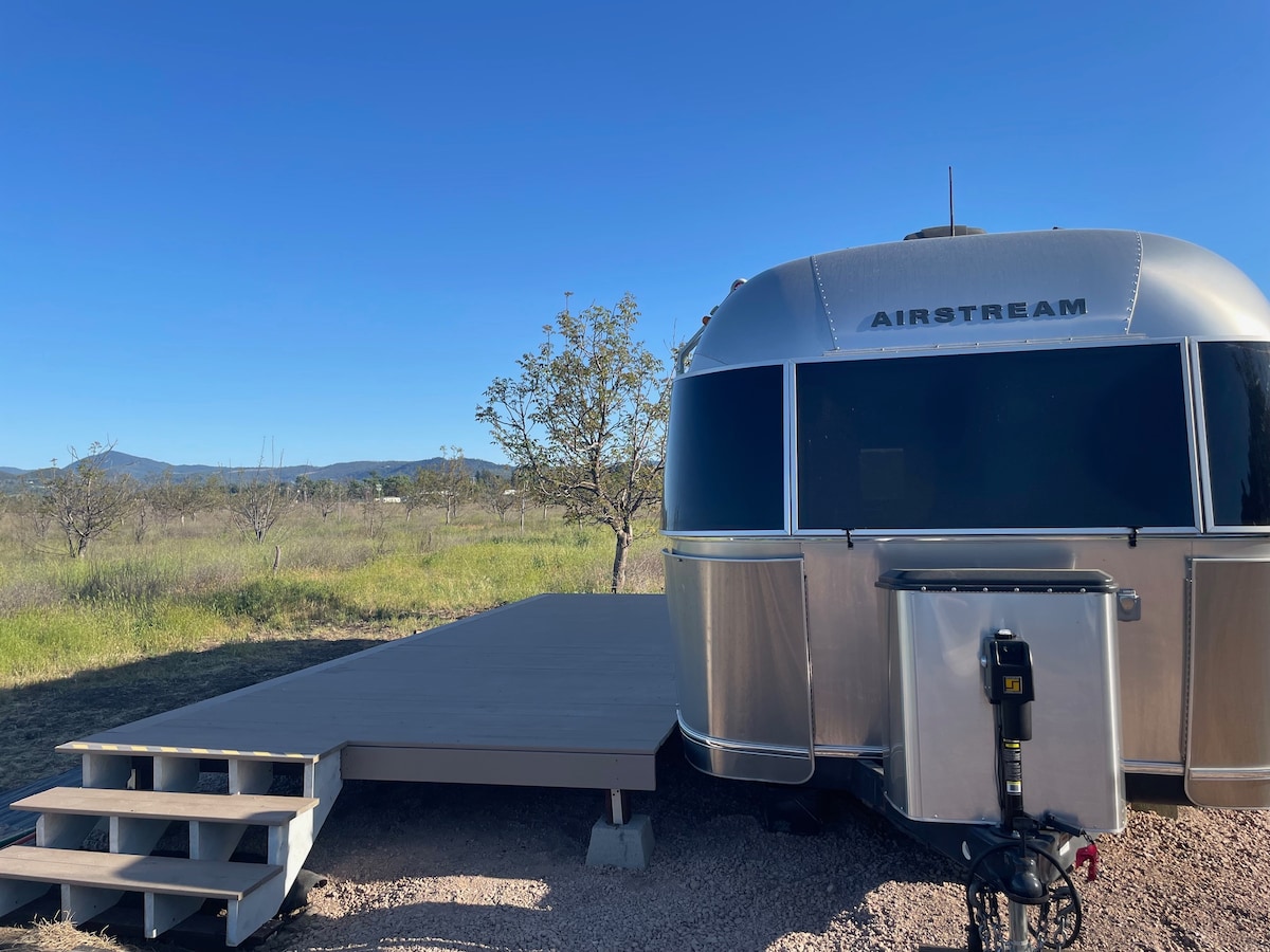 Disfruta del glamping en una lujosa Airstream Flying Cloud de 25 pies, como nueva, totalmente climatizada, con toma de corriente, internet Starlink de alta velocidad, duplica tu espacio habitable con una gran terraza privada de 8' x 20' con sillas Adirondack, sombrilla y vistas espectaculares del monte Konocti. La gran piscina privada de agua salada del propietario y la bañera de hidromasaje están disponibles por una tarifa diaria adicional de 25 USD. Reserva el uso de la piscina directamente con el propietario. Visita a la granja incluida en la estancia. Considera alquilar con Ozland Airstream One para grupos más grandes.