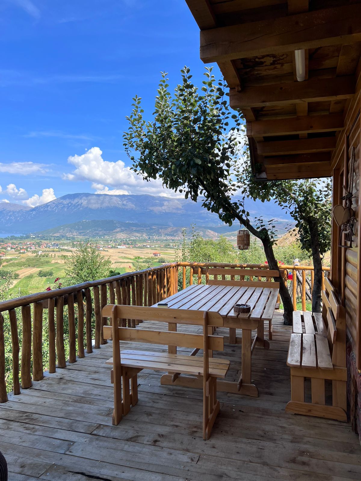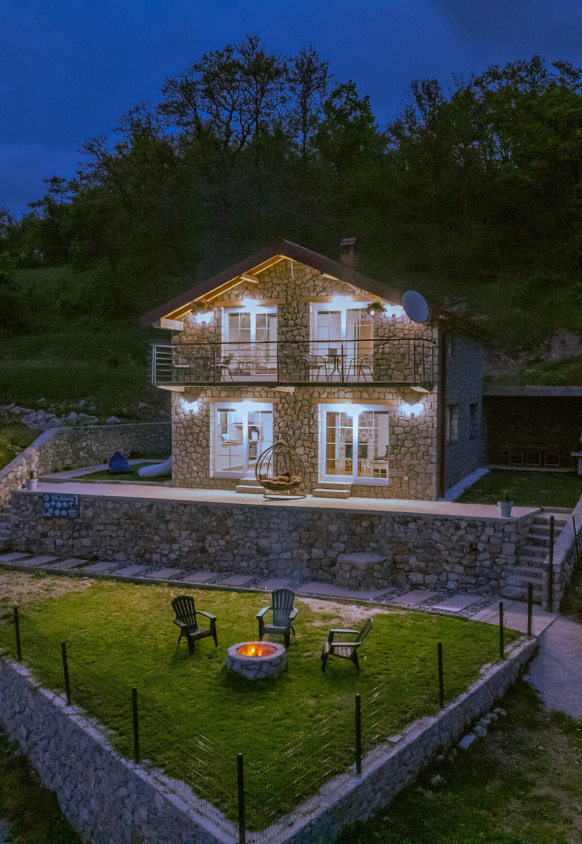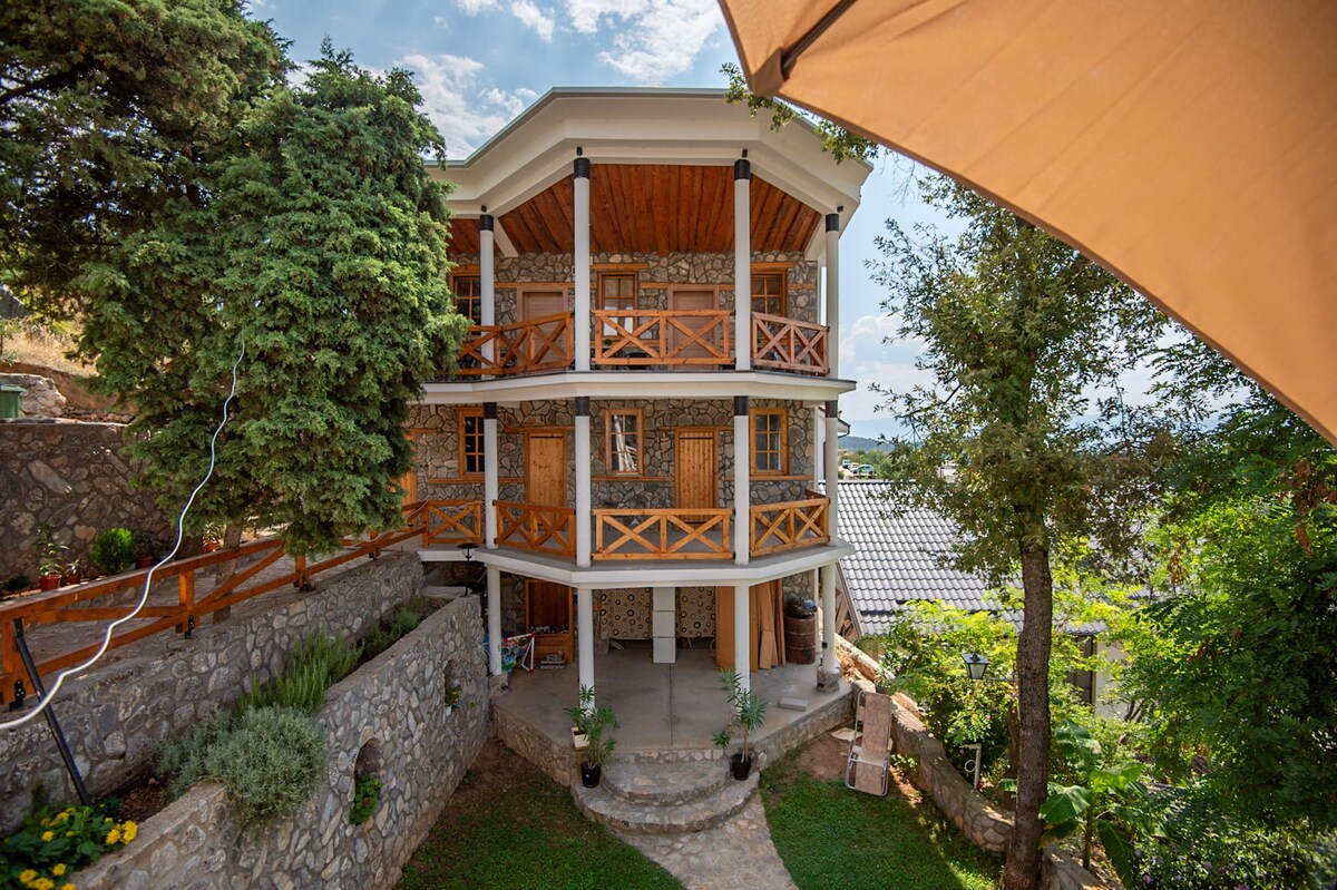 Located at the highest point of Pestani (Ohrid), the yours suite (second floor) offers a unique view of Lake Ohrid and mountain Galicica. Surrounded by greenery and an abundance of nature, you can enjoy on one of the 5 terraces overlooking the lake or the mountain, or simply sit in the garden by the fountain and listen to the sound of the river. In your de luxe suite you have 2 bedrooms, 1 living room, a full equipment kitchen, bathroom, toilet, closed terrace with fire p and huge green garden.