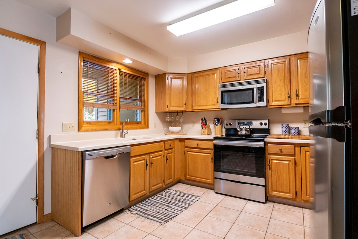 Estamos encantados de compartir nuestra casa de vacaciones, que hemos preparado con cariño para compartir. Tranquilo apartamento de 3 dormitorios a 5 minutos a pie de restaurantes, cafeterías, cervecerías y tiendas del centro de la ciudad. Hay 2 baños completos, comedor con capacidad para 6 personas, sala de estar (con chimenea, juegos de mesa, tocadiscos y una hermosa vista de las montañas sin persianas), cocina totalmente equipada (microondas, horno/estufa, cafetera, cubiertos, utensilios, ollas, sartenes, utensilios de preparación). Patio exterior con mesa/sillas/sombrilla y barbacoa de carbón.