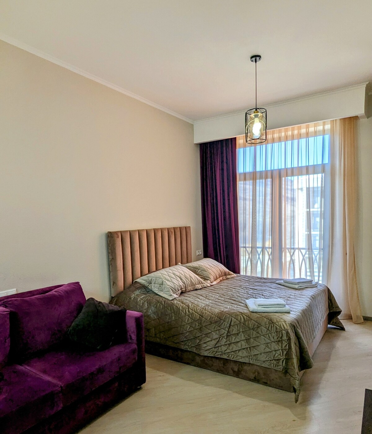 Enjoy a stylish stay in the heart of the city. Perfect for couples and families. Cozy bedroom with a double bed, spacious living room with sofa bed, fully equipped kitchen, elegant dining area with mountain view, and a small terrace. Fast Wi-Fi, central location, and warm atmosphere — everything for a comfortable and memorable stay.