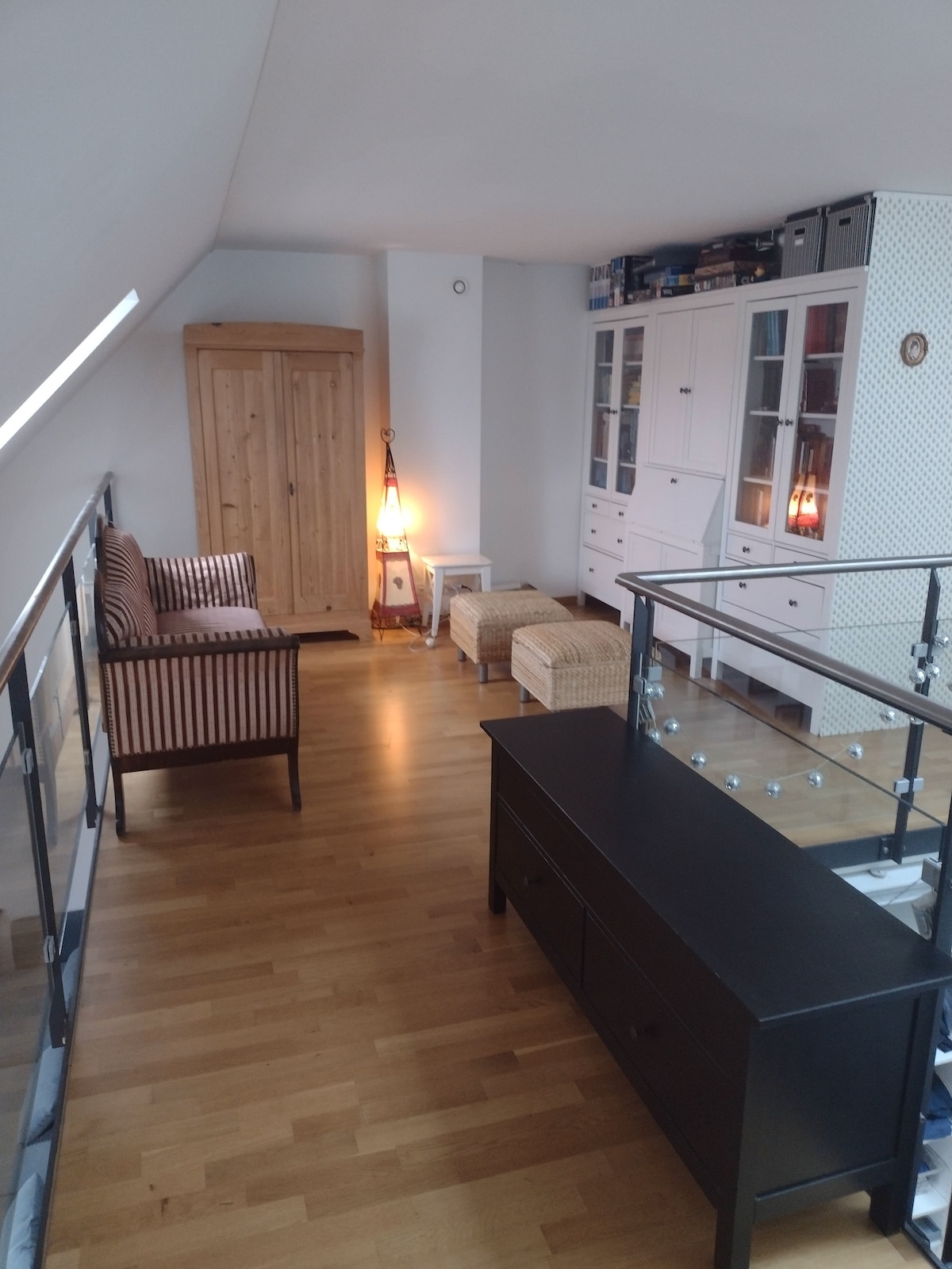 Hola, huésped: Te espera un moderno espacio de 1,5 habitaciones parcialmente renovado y amueblado (aprox. 35 m2) + trastero secundario en el último piso de una propiedad de 3 pisos con una escalera dedicada (si no te sientes cómodo con las escaleras: no hay ascensor ;-). La propiedad está muy bien situada en una ladera, rodeada de naturaleza verde. El espacio irradia una ligereza escandinava de ensueño. La pendiente del techo añade amplitud y aire al ambiente. ¡Te invitamos cordialmente a relajarte y disfrutar!