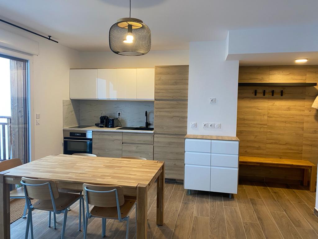 A 150 metros de las pistas y cerca del teleférico, todo se hace a pie, no hay necesidad de transporte o tomar el automóvil. Estudio para 5 personas: cama 140x190, sofá cama 140x190 y una cama alta 90x190. Decoración de madera tipo montaña. Totalmente equipado: TV, lavavajillas, horno y microondas, nevera, aparatos de raclette, fondue, creper, cafetera, Nespresso. Baño con bañera, WC independiente. Armario de esquís. A 5 minutos de la zona de piscina climatizada y balneario. Supermercado al lado del edificio.