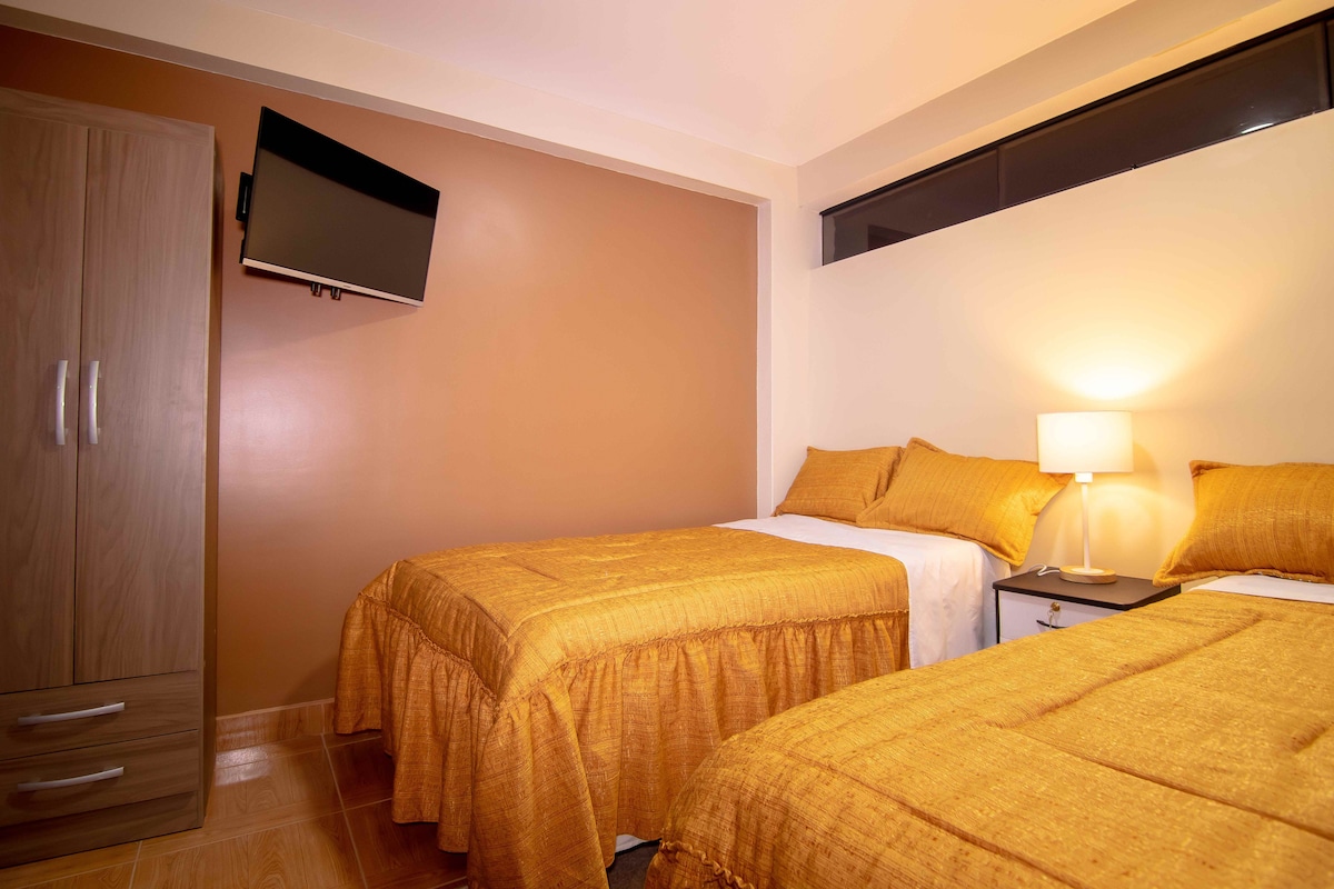 Departamento en el segundo piso, a 5 cuadras del aeropuerto Inca Manco Capac de juliaca, zona tranquila, cuenta con cocina amoblada con comedor, sala, dos habitaciones con camas de 2 plazas y se dispone de cochera con un pago adicional.