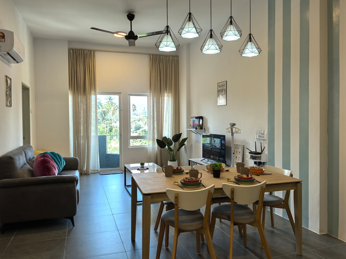 Langkawi Homestay Un nuevo departamento en Langkawi, esta mezcla de diseño contemporáneo y moderno. El lugar se encuentra en el corazón de la ciudad de Kuah. A poca distancia a pie del centro comercial Langkawi y de pocos restaurantes, también tiendas de comestibles. Nuestro departamento se está convirtiendo en uno de los más vacaciones familiares de gran demanda alojamiento. Tiene capacidad para 7 personas personas con todo en camas cómodas. Con 3 dormitorios: 2 camas tamaño queen, 1 litera y 1 sofá cama.