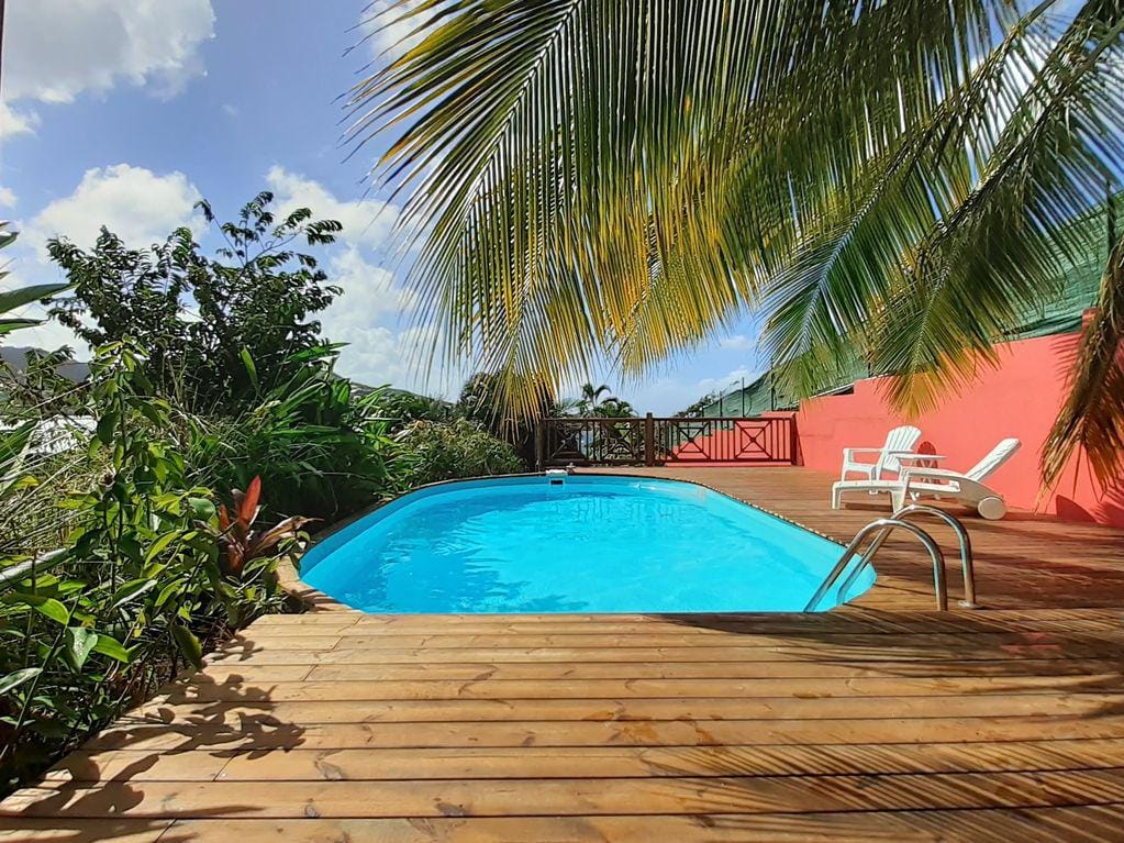Magnifique vue sur la mer des Caraïbes ! Très belle villa, calme et reposante, située dans une résidence dès plus prisées, qui surplombe la grande baie. Les réveils sont lumineux et les couchers de soleil sont à couper le souffle. Le premier bain de mer à 4 mn en voiture. La villa est aménagée avec goût, des matériaux de qualité et totalement équipée. Piscine au sel. Jardin. BBQ. Localisation idéale pour rayonner partout sur l'île. Parking privé sécurisé pour 2 voitures. Supermarché à 5 minutes.