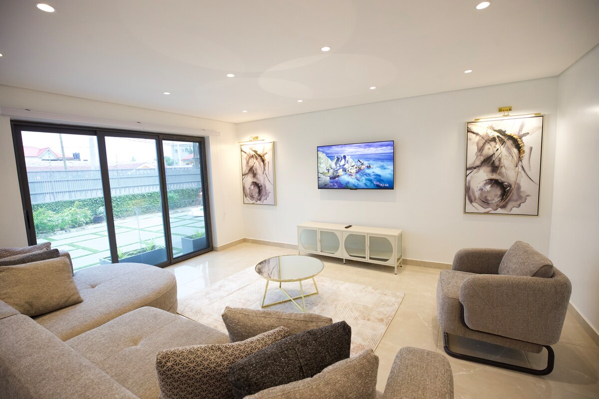24/7 200kva standby generator and Solar DSTV with full channel access Netflix Breathtaking views High-speed internet Located in the heart of Accra, we're just a stone's throw from Achimota Mall and De Temple social center, perfect for swimming and exercising. The airport is 30-minute drive away. For your convenience, we have a professional laundry service, barber shop, and hair salon on site. Plus, "Ayewamu by Jane" is right next door, serving up delicious local cuisine.