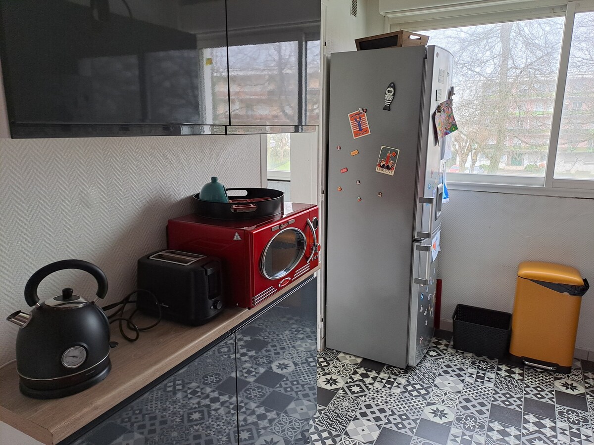 Au cœur du centre ville commerçant de Lorient. -LINGES INCLUS -Accès autonome avec boîtier à clé -Places de parking gratuites dans la rue (limitées 1h30 de 9h à 12h, 14h à 18h) + parkings place Alsace Lorraine, Jules ferry, souterrain Nayel -Gare et port à moins de 15 minutes à pieds. -Couloir d'entrée pouvant accueillir des vélos, poussettes... -Café, thé, machine Espresso dolce gusto, bouilloire, grille-pain -2ème étage sans ascenseur