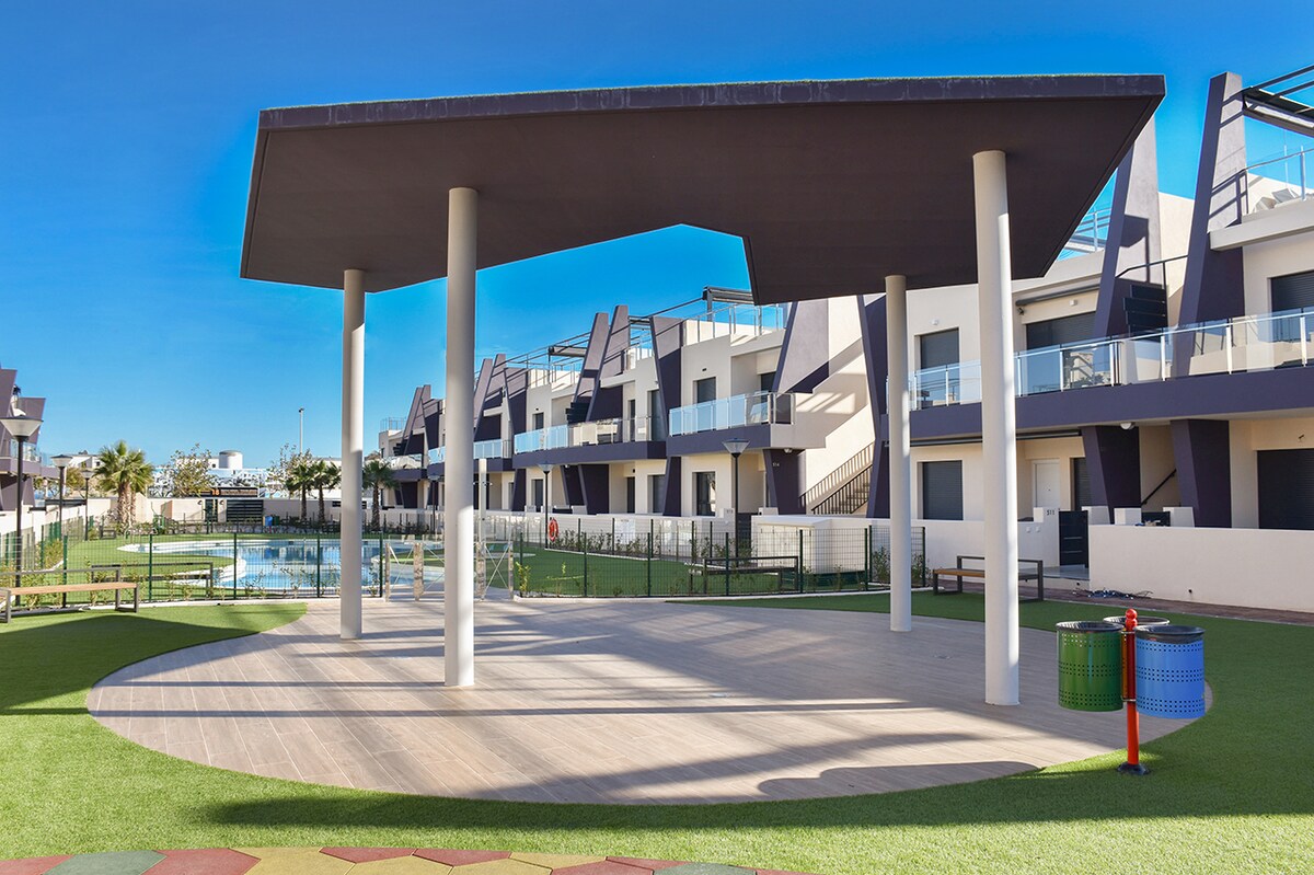 Precioso y moderno bungalow de planta baja de 2 dormitorios esta ubicada en la famosa zona de Playas Higuericas que destaca por su magnifica playa, restaurantes para diferentes gustos y largo paseo al lado del mar, que se puede recorrer andando o en bici, disfrutando de las vistas y de las brisa marina También podrán disfrutarse de enorme zona común con 2 piscinas, gimnasio exterior, zona infantil etc....