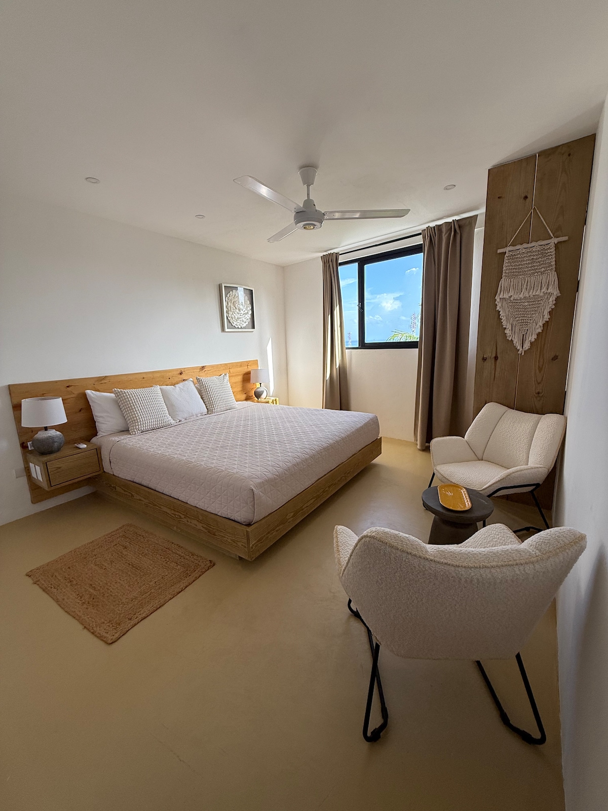 Escápate al paraíso en nuestro espacioso hotel boutique recién renovado. ¡Nuestro hotel ecológico está a pocos pasos de la playa en el corazón de Las Terrenas! Despiértate con impresionantes vistas al mar, relájate junto a nuestra lujosa piscina de tres niveles rodeada de palmeras o siente la brisa del mar mientras te relajas bajo el sol. Con serenidad tropical, lujo moderno y la playa a solo unos minutos, ¡tu escapada perfecta te espera! La suite incluye una cama king, baño privado y aire acondicionado.