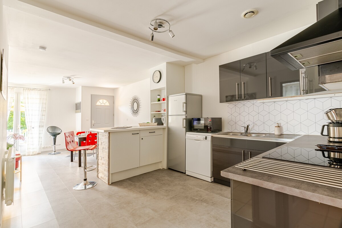 2 habitaciones (cama de matrimonio + 2 camas individuales) Salón y cocina equipados Cuarto de baño con ducha a ras de suelo Aseo independiente Terraza cubierta Despensa/Lavadero con lavadora y secadora Aire acondicionado reversible Parking privado. Se proporcionan sábanas y toallas Cerca de actividades / comercios Alojamiento a 10 minutos de Cahors Autopista a 5 minutos Numerosos sitios turísticos en las cercanías