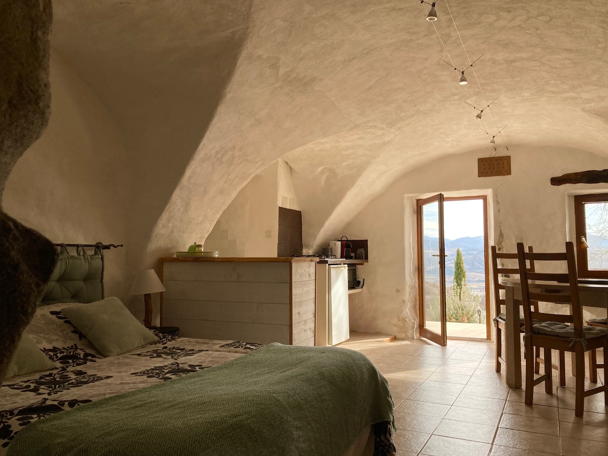 El estudio de 30 m² se encuentra bajo las bóvedas del antiguo horno de pan de nuestra casa. La sala de estar consta de una pequeña cocina equipada con lo esencial, así como una zona de dormitorio con una cama doble; en la parte inferior de las bóvedas se esconde un pequeño baño independiente. Aislado en el campo al pie de las montañas, la terraza privada le ofrecerá una hermosa vista del valle de la Durance. Ideal para relajarse también puede disfrutar de salidas para pasear y del sitio de escalada.