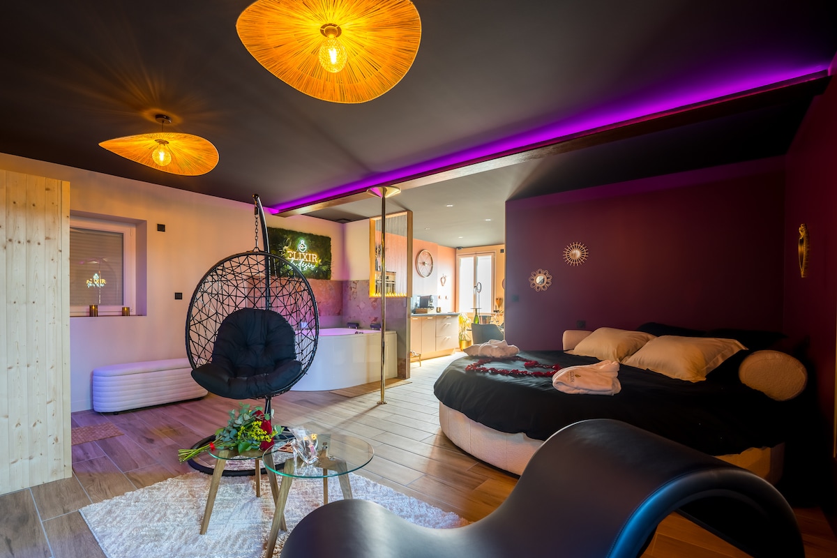 Bienvenue chez Instant à deux , découvrez notre loft privatif de 45m² dotez d'une baignoire balneo 2 places, d'un sauna et d'un filet suspendu. Le loft comprend un grande salle de bain composées d'une double douche XXL , une cuisine équipée , un grand lit (160x200) avec une literie de qualité. l'étage est équipée d'un fauteuil tantra. Un ciel étoilé viendra accentuer la détente et le bien être de votre séjour. Lit fait a l'arrivée , peignoirs et serviettes fourni.