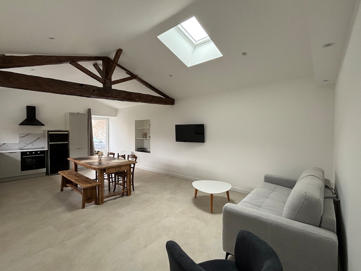 Acogedora casa rural 3* (3 espigas) de 40 m2, cerca de MAIF, MSA, DARVA, Altima Assurances y la zona comercial de Chauray. A 20 minutos de la estación de tren y del centro de la ciudad Alojamiento amueblado en el piso de arriba de una dependencia sobre los garajes de una propiedad cerrada, acceso por escalera exterior de piedra que da a una terraza de 16 m2. Calefacción central, conexión WiFi, TV de pantalla plana. Cocina americana totalmente equipada (horno, LV, nevera, congelador, microondas, cafetera Senseo. Cama de 160 + equipo BB Cuarto de baño con gran ducha italiana.